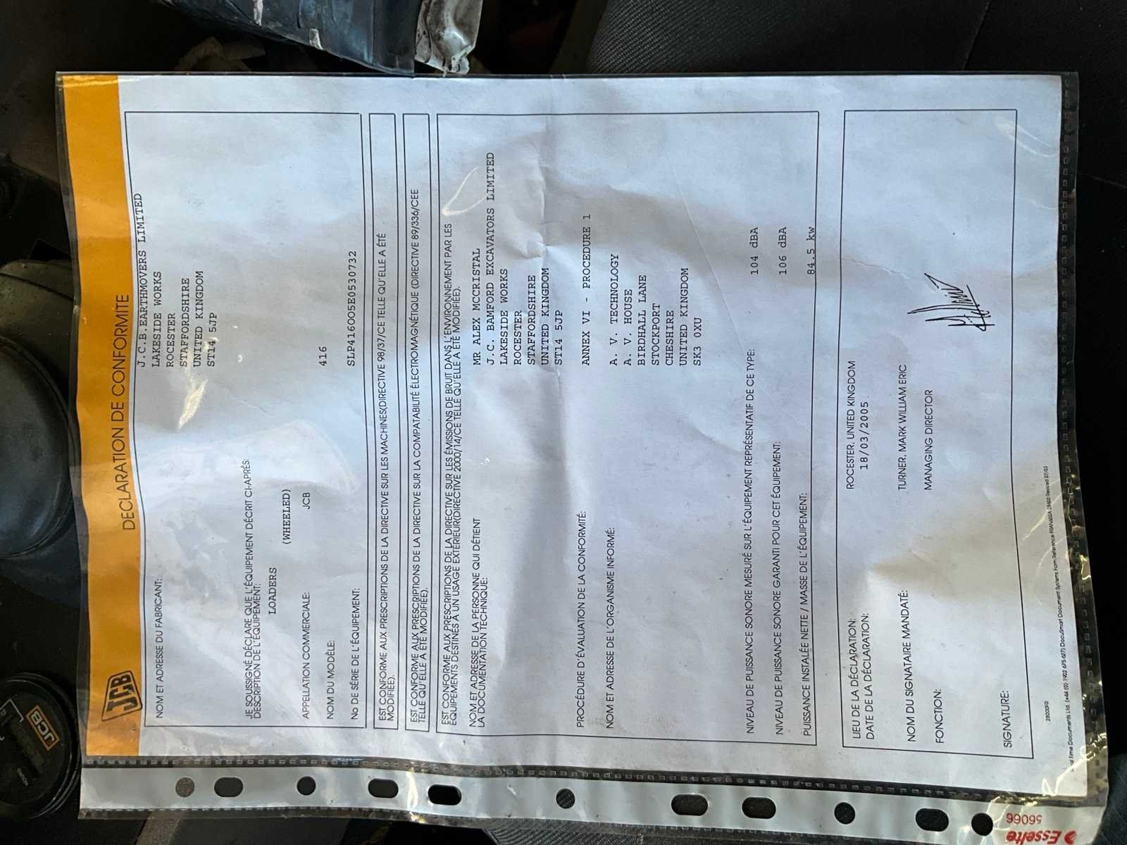 Aanwezige documenten: certificaat van overeenstemming No Merk: JCB Type: 416 Bouwjaar: 2005 Serienummer: SLP416005E0530732 Afgelezen urenstand: 5273 Eigen gewicht: 9500kg