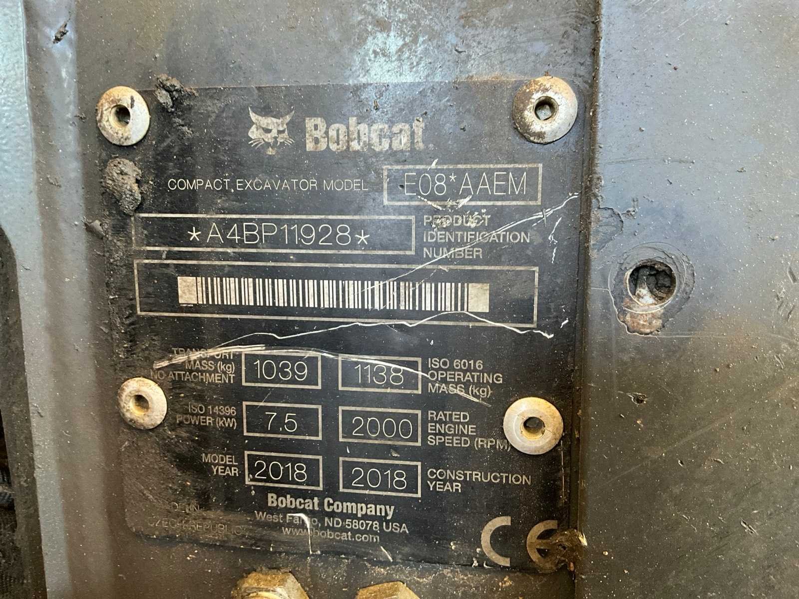 Inclusief 3 graafbakken, 30, 40 en 80cm No Merk: Bobcat Type: E08 Bouwjaar: 2018 Serienummer: A4BP11928 Motorvermogen (kW): 7.5kW Brandstof: Diesel Inclusief graafbak: Yes Afgelezen urenstand: 1940