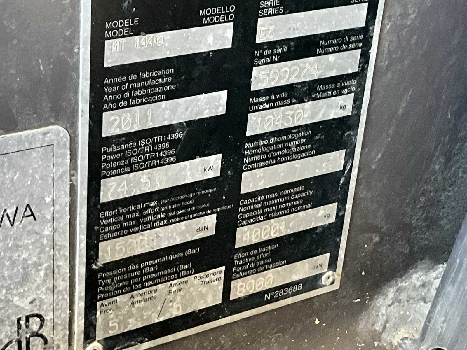 No Merk: Manitou Type: MT1440 Bouwjaar: 2011 Serienummer: 599274 Motorvermogen (kW): 74.5kW Hefvermogen: 4000kg Cabine: true Afgelezen urenstand: 3813