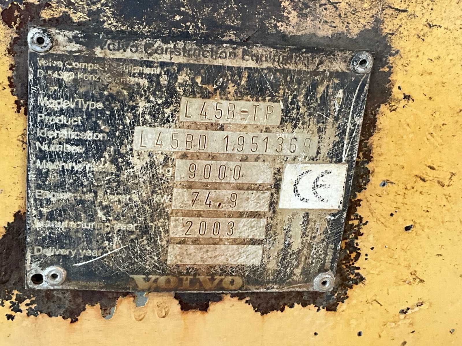 No Merk: Volvo Type: L45B-TP Bouwjaar: 2003 Serienummer: L45BD 1951369 Brandstof: Diesel Graafbak afm. b: 2000mm Cabine: true Afgelezen urenstand: 4131
