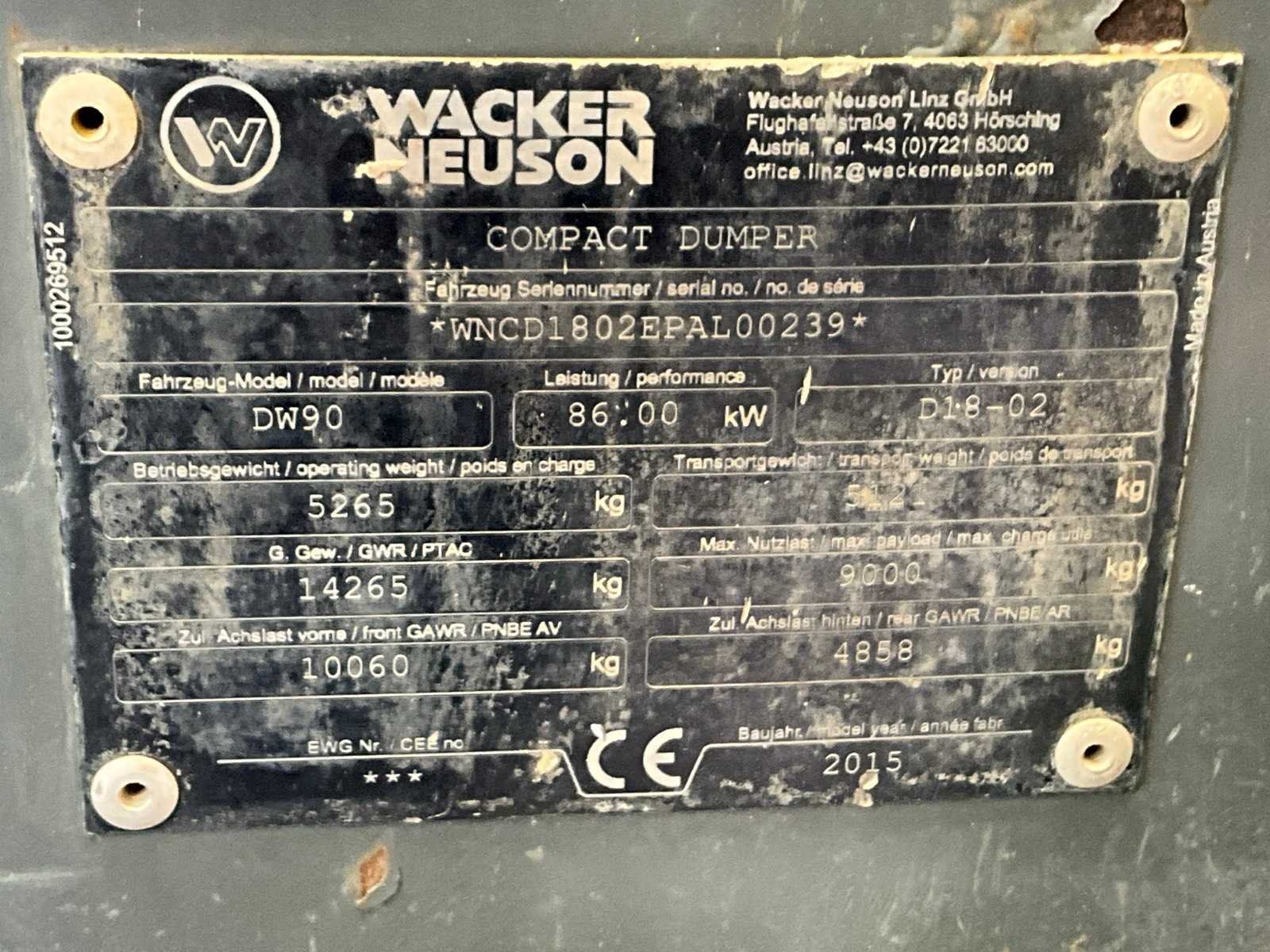 No Merk: Wacker Neuson Type: DW90 Serienummer: WNCD1802RPAL00239 Bouwjaar: 2015 Afgelezen urenstand: 2941