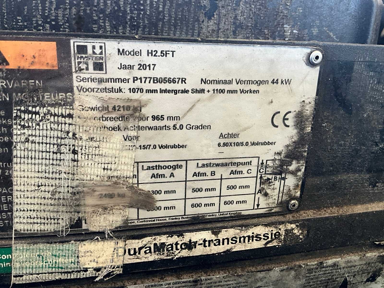Zonder sleutel, start en rijdt wel (via booster). No Merk: Hyster Type: H2.5FT Bouwjaar: 2017 Serienummer: P177B05667R Afgelezen urenstand: 5385 Duplex mast: true Lepellengte: 1100mm Vol rubber banden: true LPG: true