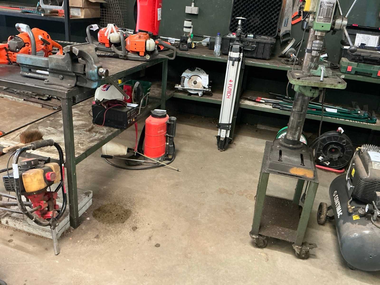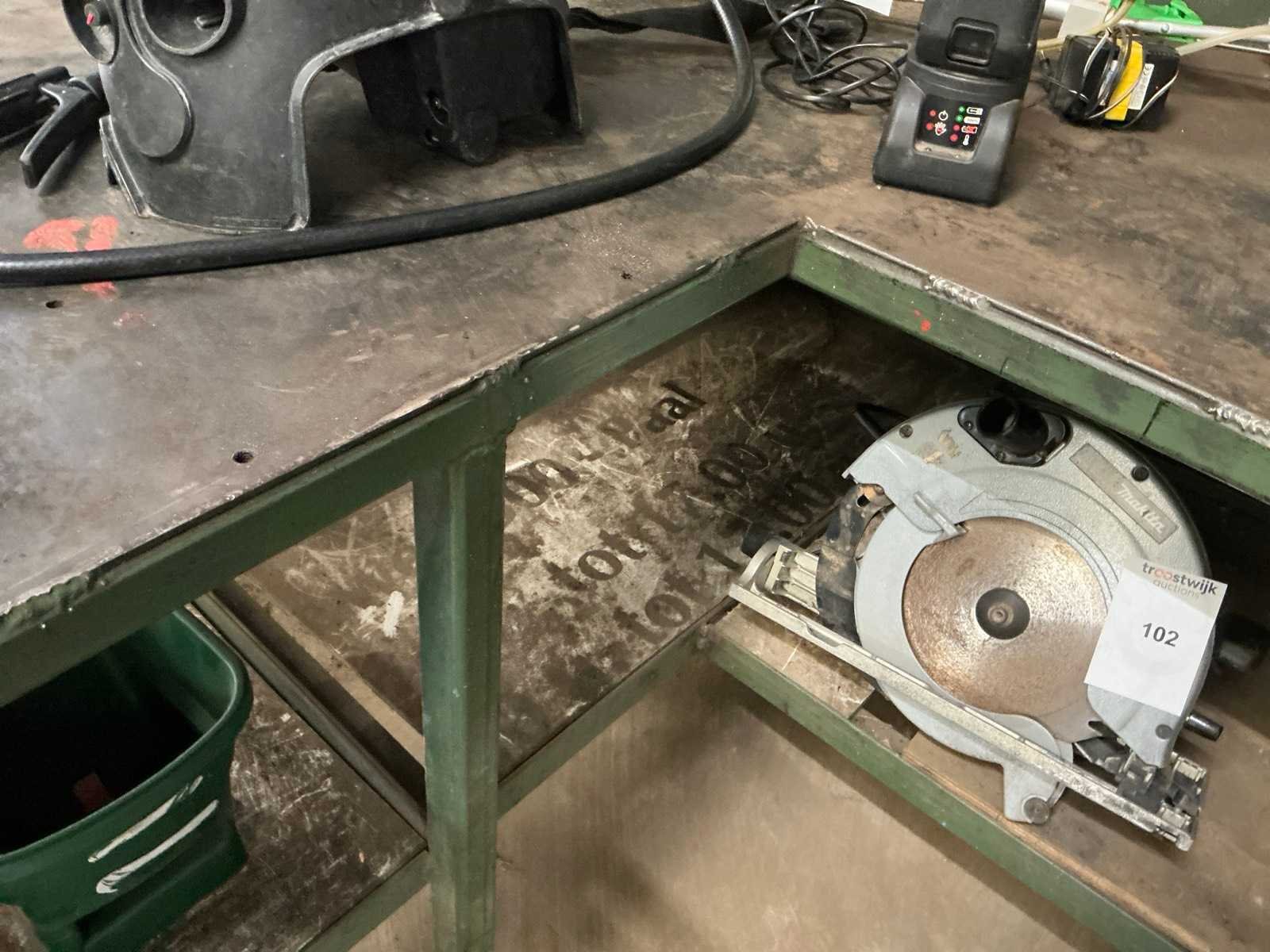 Gelaste L-vormige metalen werkbank met bankschroef, totale afmeting circa 251/290x70xH91cm. Zonder inhoud Nee