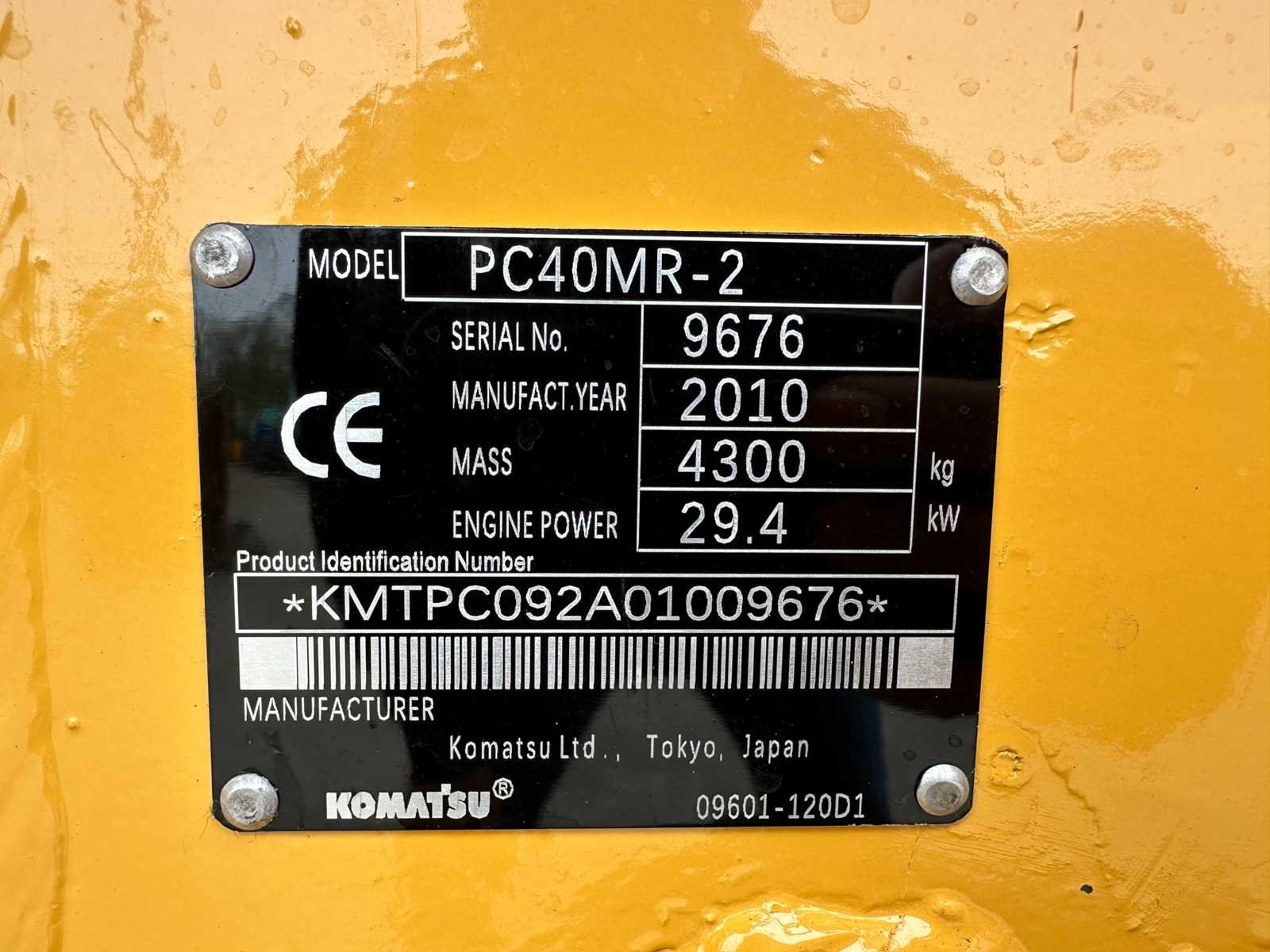 -Hamerleidingen -Mechanische snelwissel -Duwblad -Tandenbak -Geen documenten Nee Merk: Komatsu Type: PC40MR-2 Bouwjaar: 2010 Serienummer: KMTPC092A01009676 Merk motor: Yanmar 4D88E Motorvermogen (kW): 29.4kW Aantal cilinders: 4 Brandstof: Diesel Graafbak afm. b: 650mm Rups breedte: 400mm Eigen gewicht: 4300kg Totale afmeting L: 5400mm Totale afmeting Breedte: 1950mm Totale afmeting Hoogte: 2600mm GS Code: 8429521200