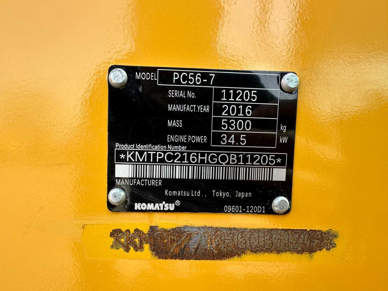 -Hamerleidingen -Tandenbak -Duwblad -Rupsen met rubber pads -Geen documenten Nee Merk: Kubota Type: PC56-7 Bouwjaar: 2016 Serienummer: KMTCPC216HGQB11205 Merk motor: Komatsu Motorvermogen (kW): 34.6kW Aantal cilinders: 4 Brandstof: Diesel Graafbak afm. b: 650mm Rups breedte: 400mm Afgelezen urenstand: 5389 Eigen gewicht: 5300kg Totale afmeting L: 5500mm Totale afmeting Breedte: 2000mm Totale afmeting Hoogte: 2600mm GS Code: 8429521200