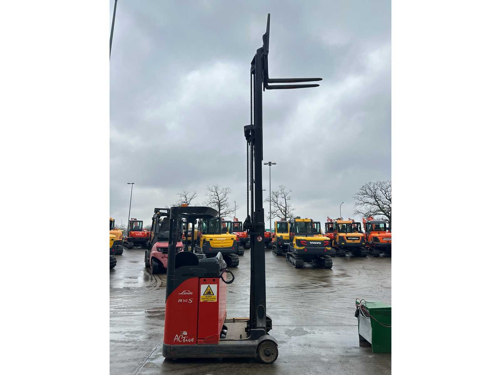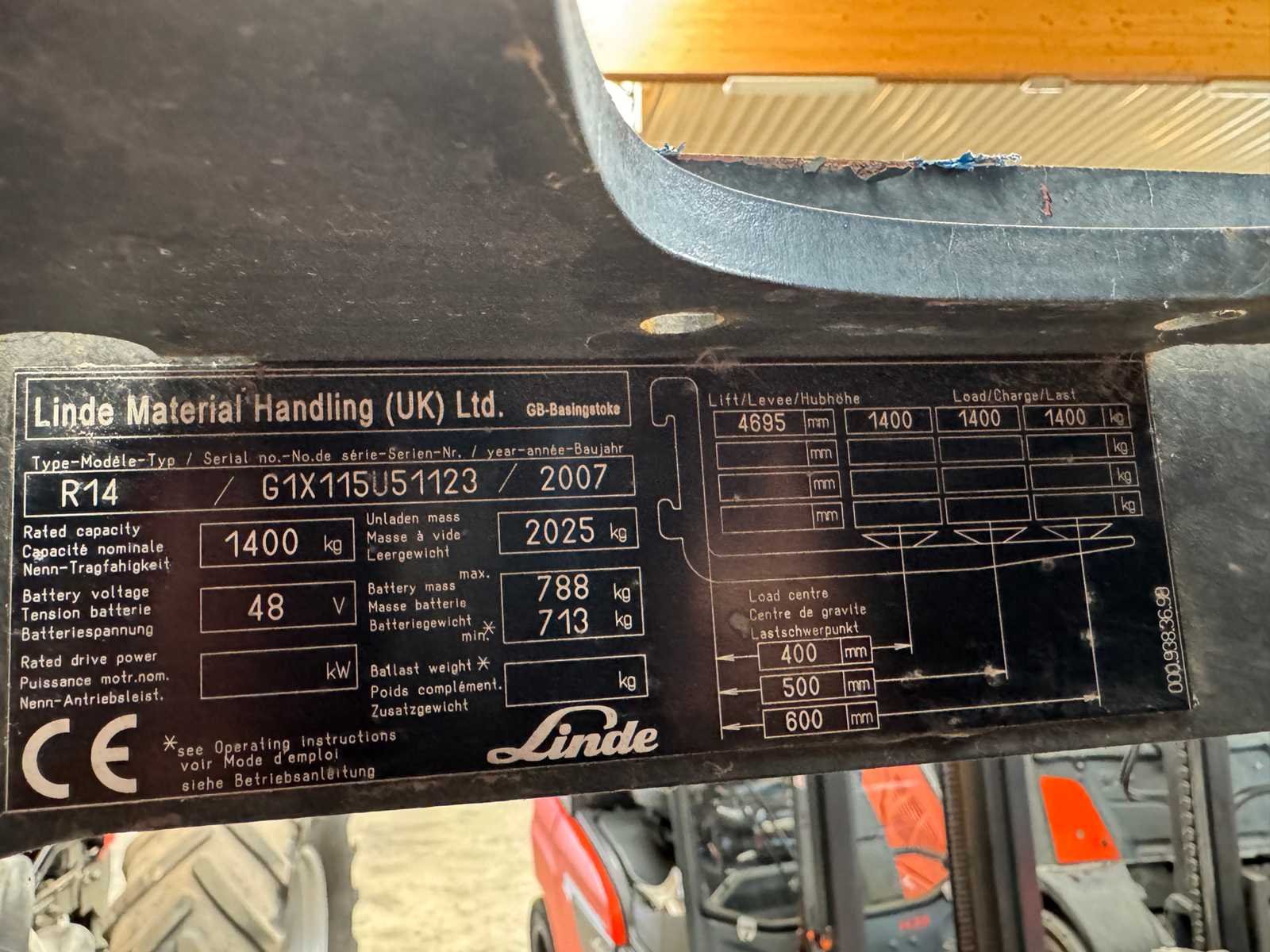 -Side Shift -Geen documenten Nee Merk: Linde Type: R14 Bouwjaar: 2007 Serienummer: G1X115U51123 Brandstof: ACCU Mast: Triplex Soort band: Vol Rubber Aantal wielen: 3 Side-shift: true Triple mast: true Eigen gewicht: 2025kg Hefvermogen: 1400kg Lepellengte: 1000mm Max. hefhoogte: 4695mm Vol rubber banden: true Totale afmeting L: 2200mm Totale afmeting Breedte: 1300mm Totale afmeting Hoogte: 2200mm