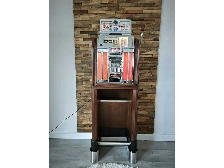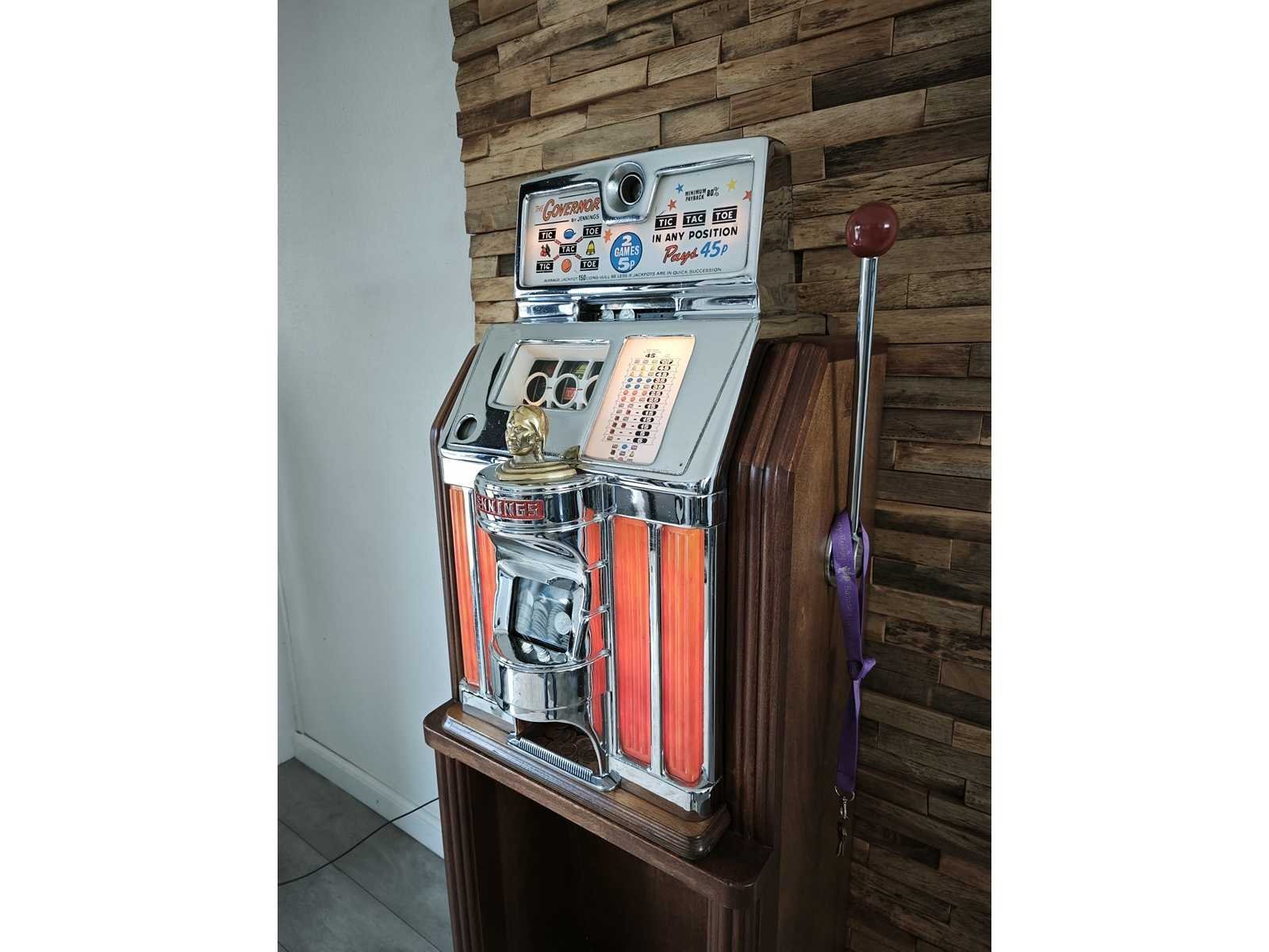 Slotmachine in hoge casinoconsole met verlichte zuiltjes. 2 trekken voor 5 pence. Accepteert originele Amerikaanse 5 Pence stukken en betaalt deze ook uit (worden erbij geleverd) Geheel mechanisch, stroom is alleen voor de verlichting. Nee Merk: Jennings Type: The Governor Bouwjaar: 1953