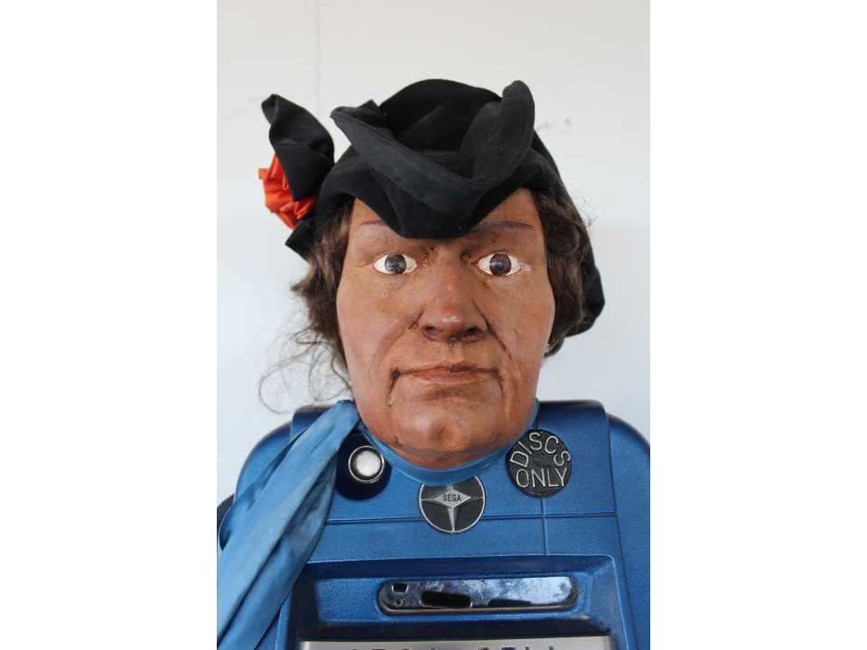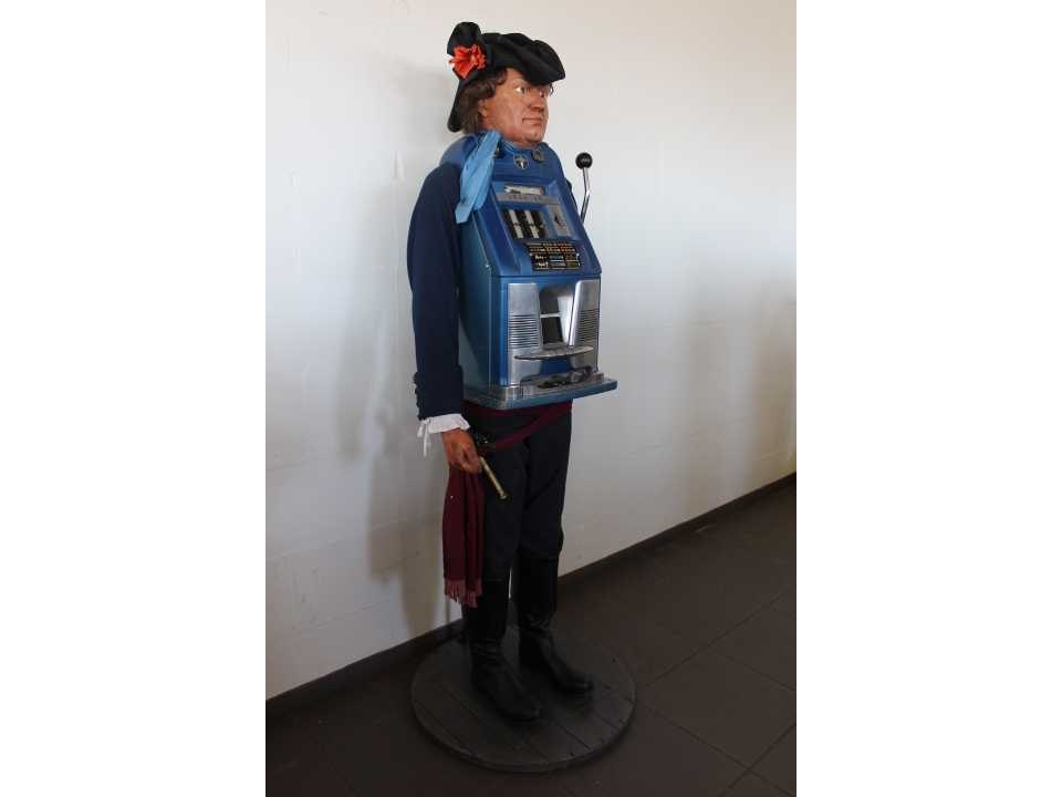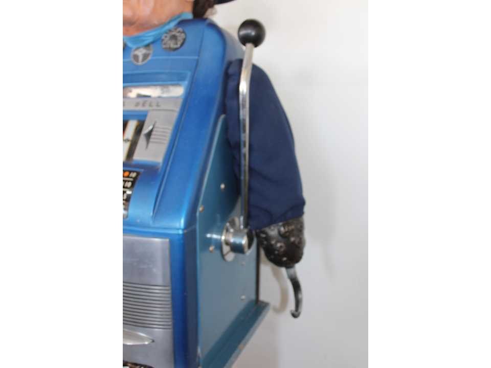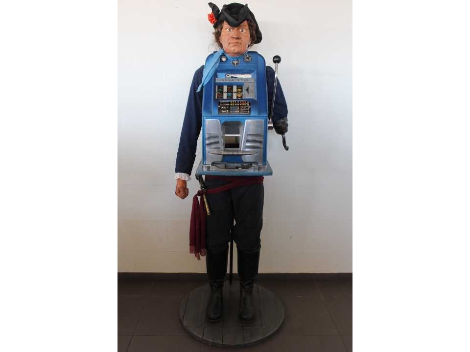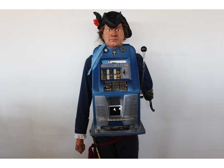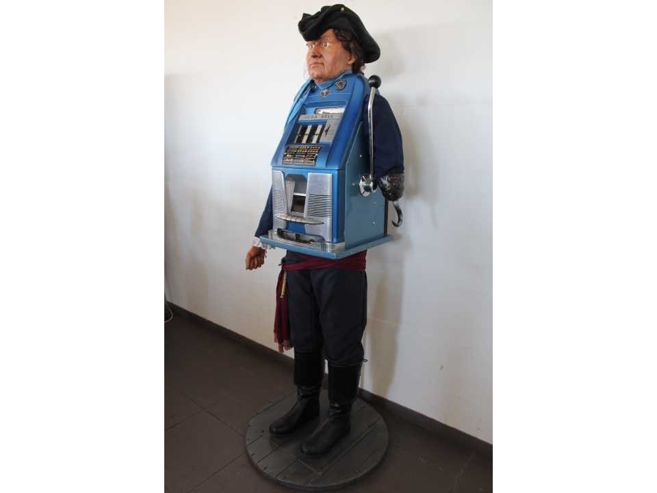 Piraat met slotmachine, werkt op Amerikaanse Quarters en betaalt deze ook uit, zeer decoratief No Merk: Sega Type: Bell High Top Hoogte: 190cm Gewicht: 85kg Bouwjaar: 1954