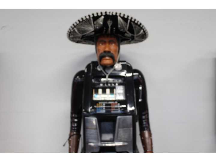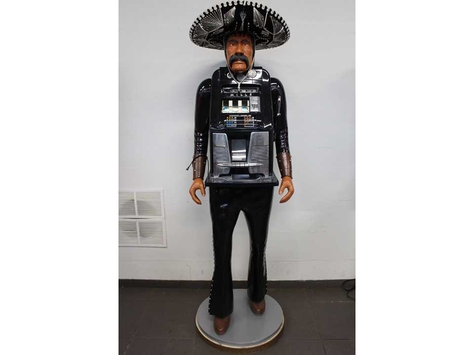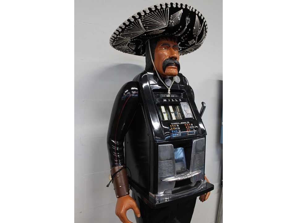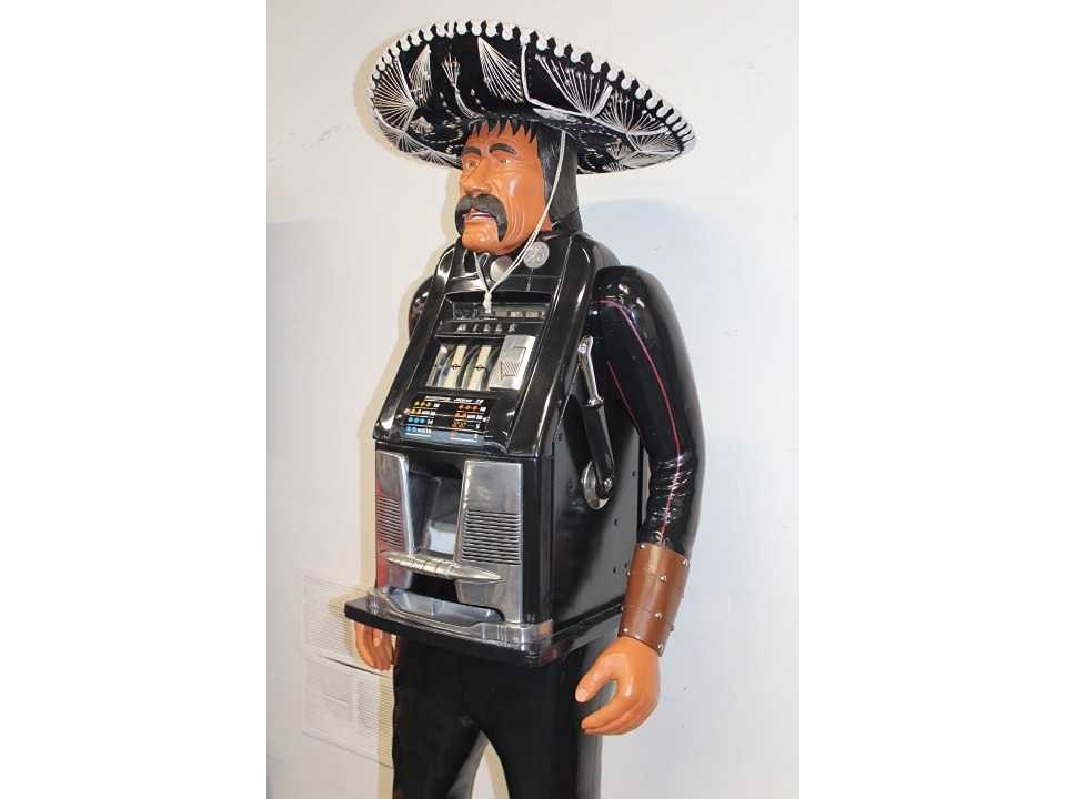 Unieke Mexicaan met Mills High Top slotmachine. Handgemaakt in Amerika. Werkt op Amerikaanse dimes en betaalt deze ook uit. Cowboy is gesigneerd met stempel. Nee Merk: Richard de Long Type: Mills High Top Materiaal: Hout / Metaal Bouwjaar: 1950