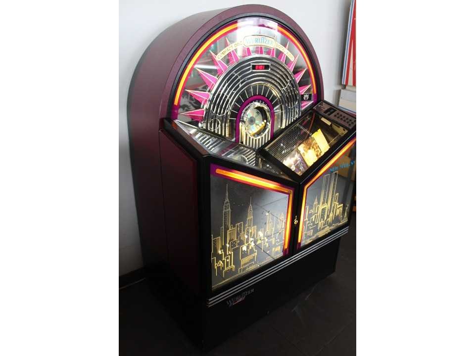 100 CD uitvoering, met bubble tubes, Twin Towers New York, Philips CDM speler, afstandsbediening Nee Merk: Wurlitzer Type: New York Bouwjaar: 1996 Gewicht: 110 Lengte: 670mm Breedte: 990mm Hoogte: 1470mm