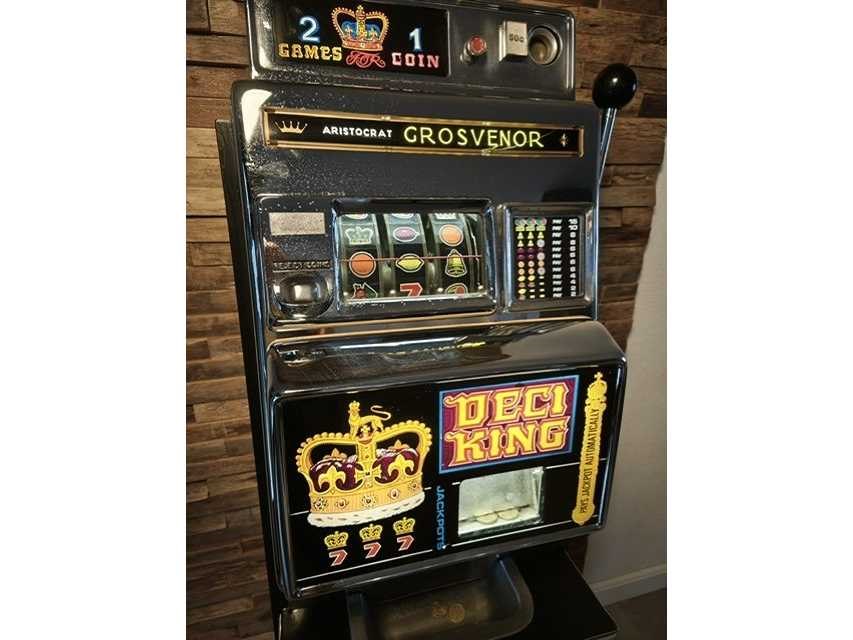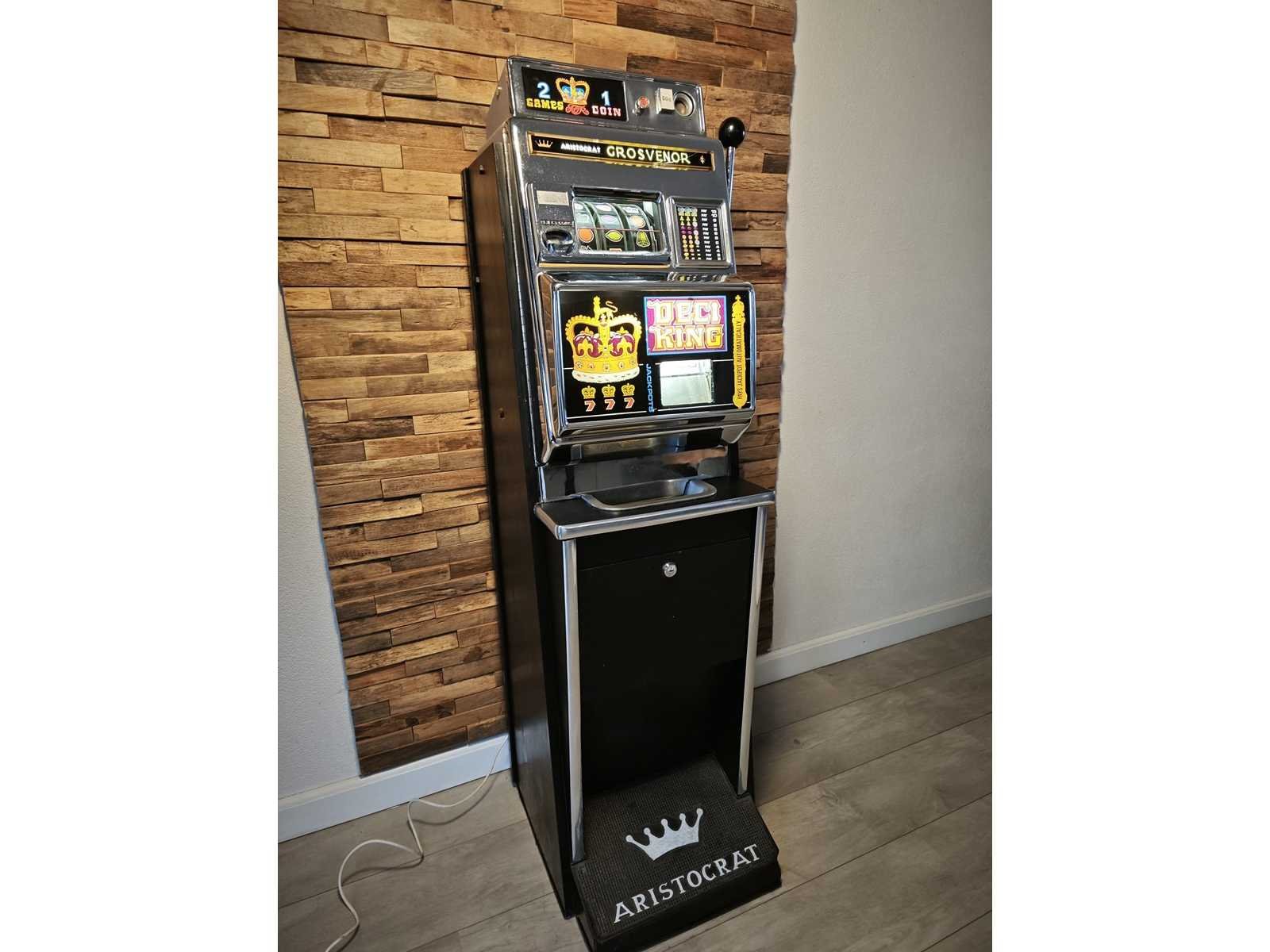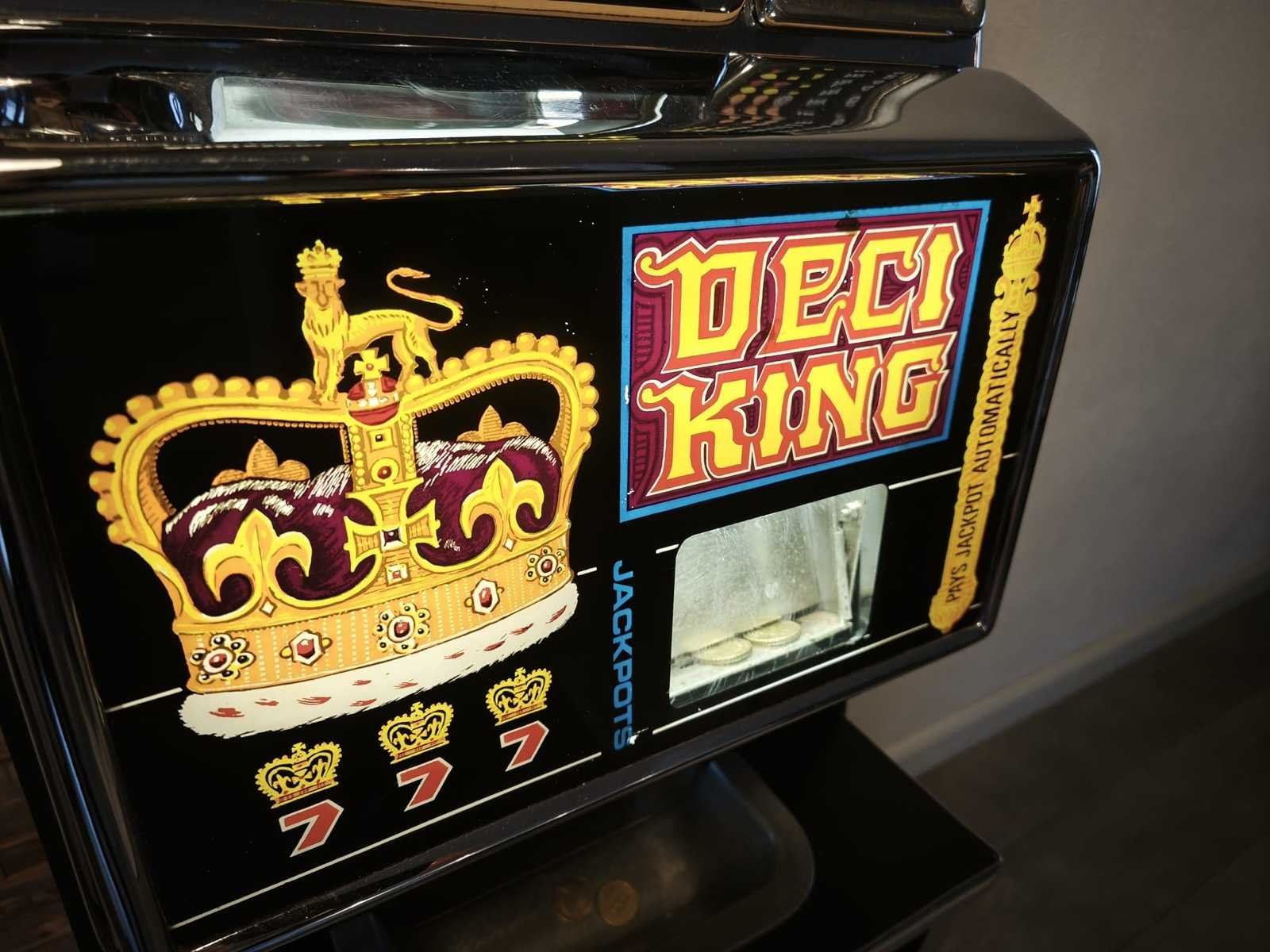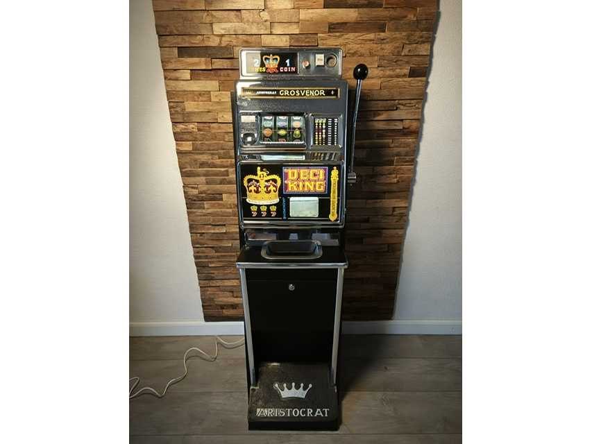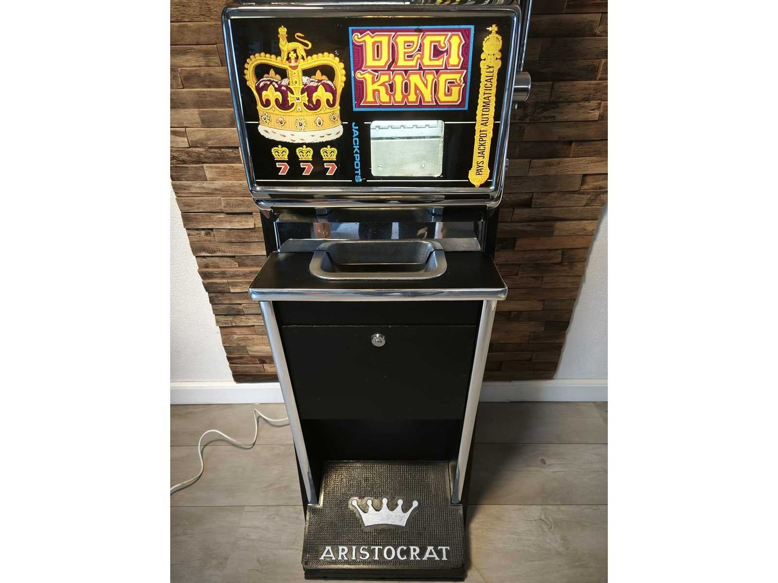 Slotmachine in casinoconsole, werkt op 0,50 eurocent en betaalt deze ook uit, met jackpot en verlichting, afkomstig uit casino Nevada Nee Merk: Aristocrat Type: Deci King Bouwjaar: 1963
