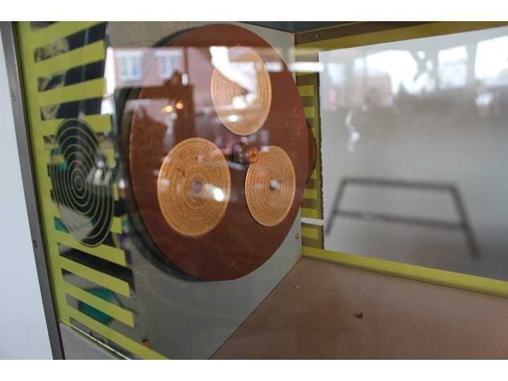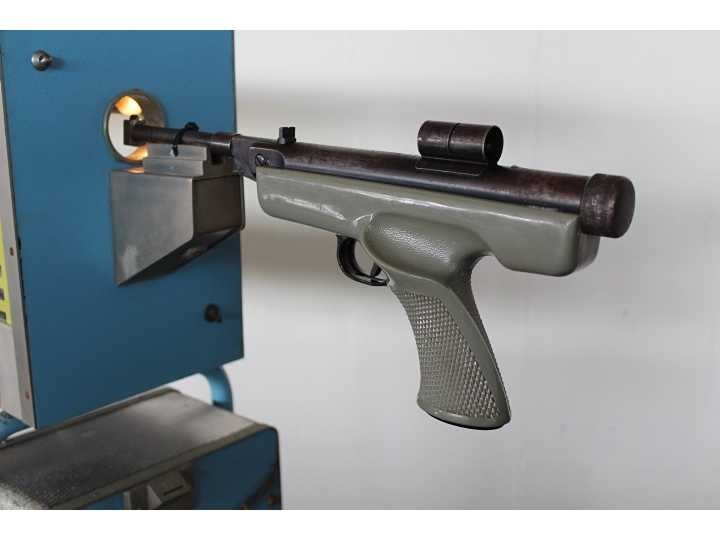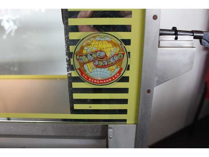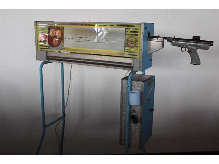 Schietspel met echt luchtdruk pistool, met koperen kogeltjes, met muntinworp Nee Merk: Bergmann Type: Arizona Lengte: 130cm Breedte: 51cm Hoogte: 140cm Gewicht: 40kg Bouwjaar: 1963