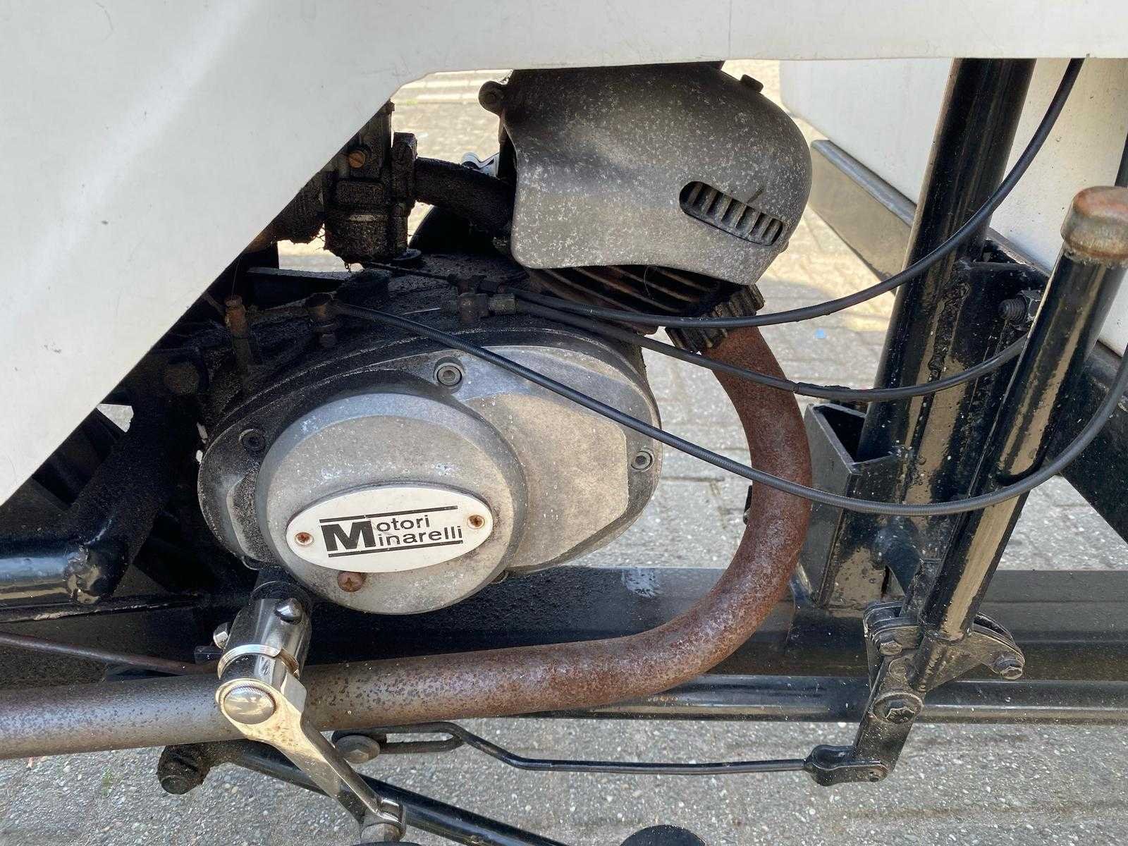 Brommer 50 cc met koelingsruimte, koelsysteem is vernieuwd maar moet nog gevuld worden, rijdt en remt goed, 185 x 115 cm, brommer 120 cm, 200 cm hoog, geen documenten, jaren 50 van de vorige eeuw Nee Merk: Apollo