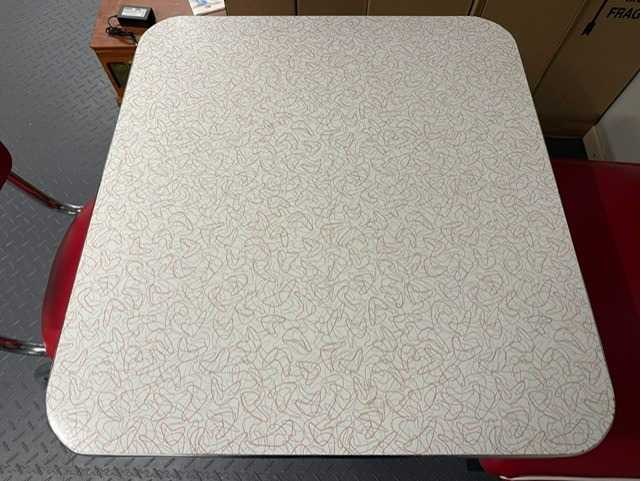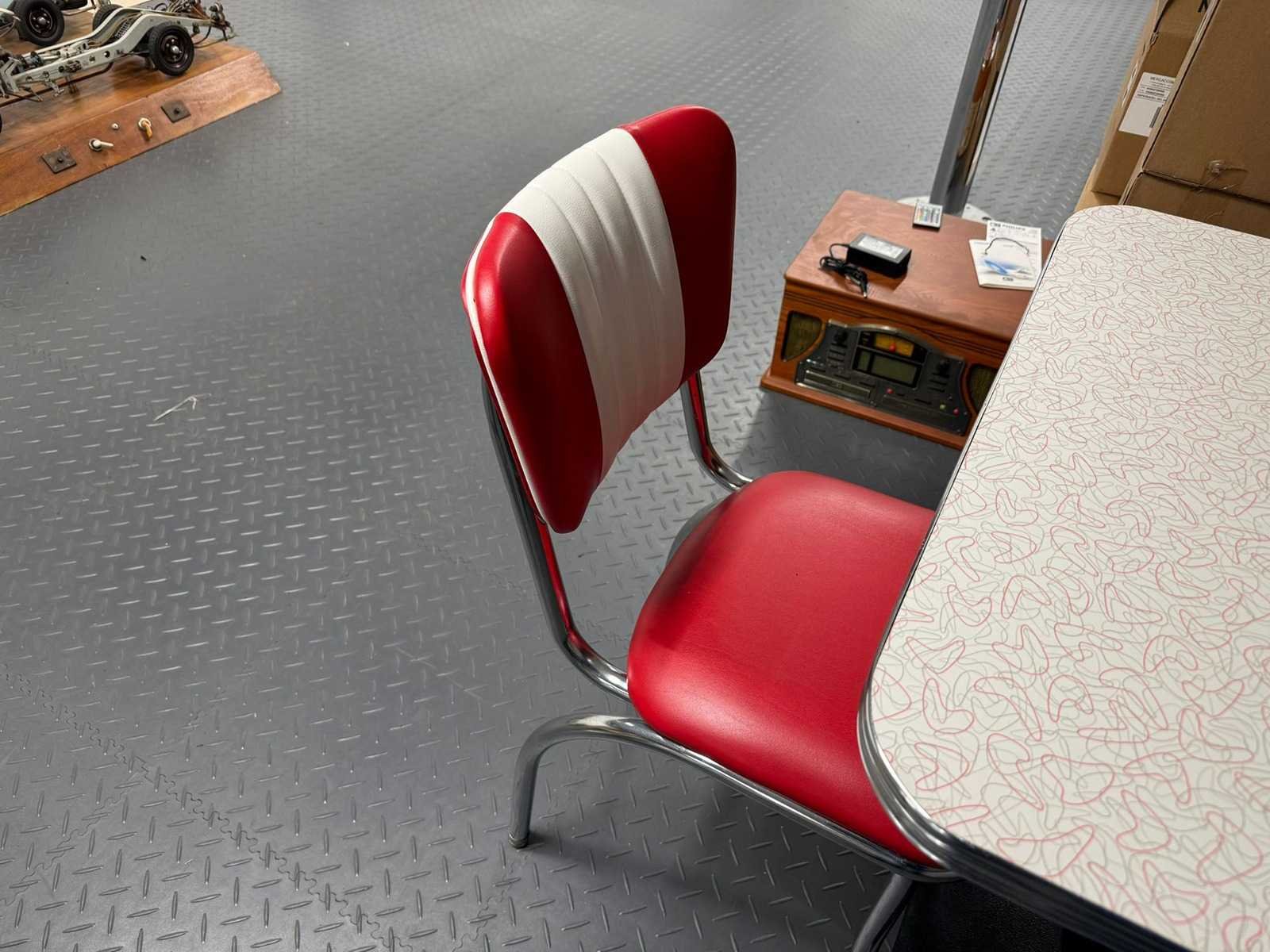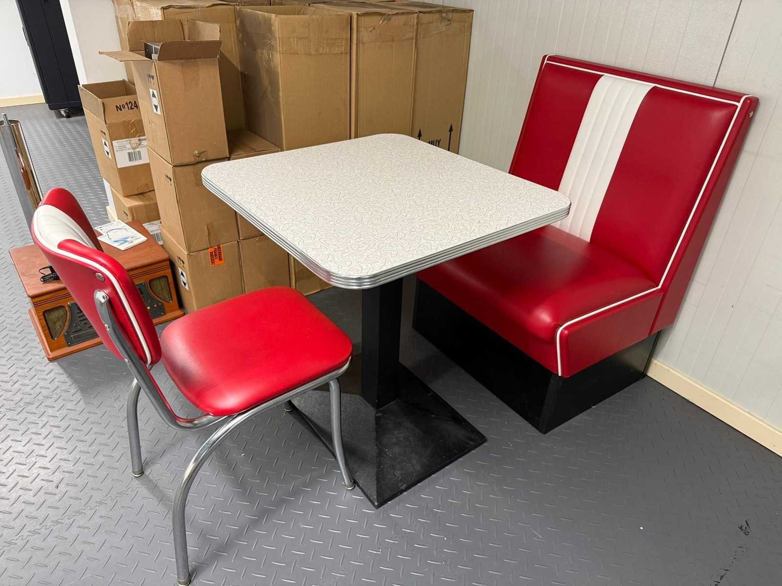 Dinerset bestaande uit 1 persoonsbank, tafel met poot (106 x 75 cm) en stoel Nee Merk: Fifties Model: Dinerset Kleur: Rood/Wit