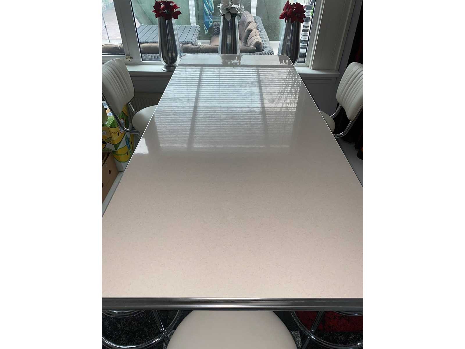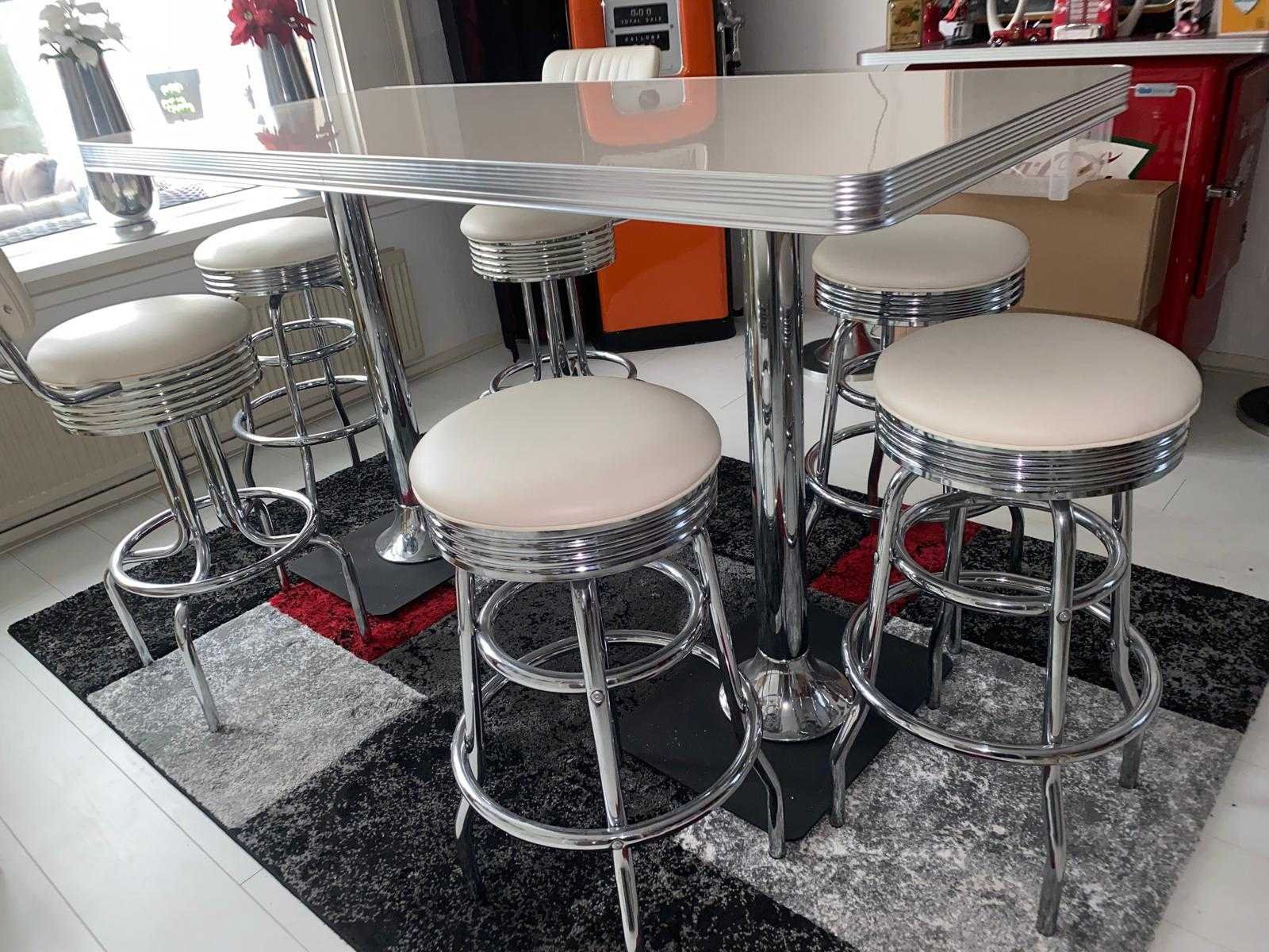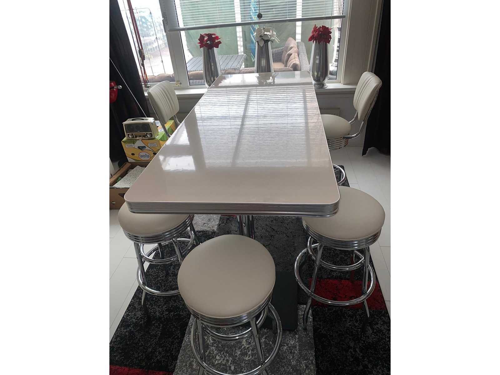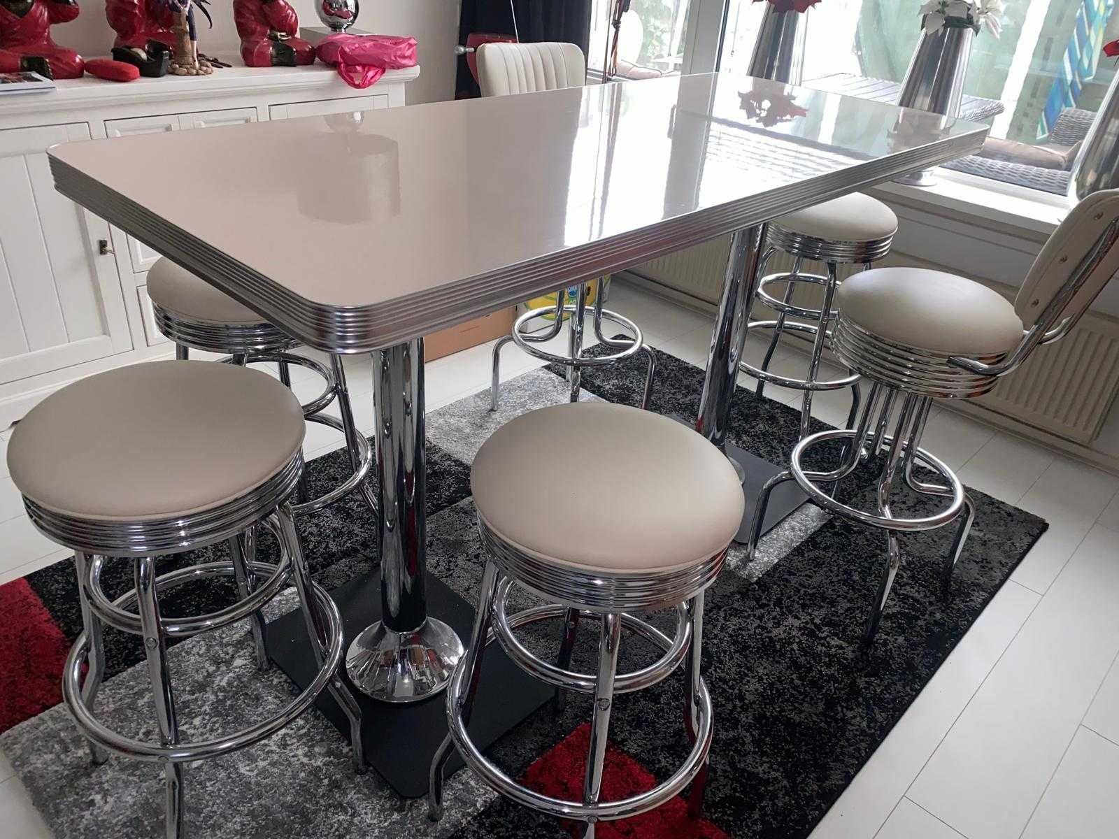 Dinerset bestaande uit 6 barkrukken waarvan 2 met rugleuning, tafel met dubbele poot (200 x 80 cm) Nee Merk: Fifties Model: Dinerset Kleur: chroom/Wit