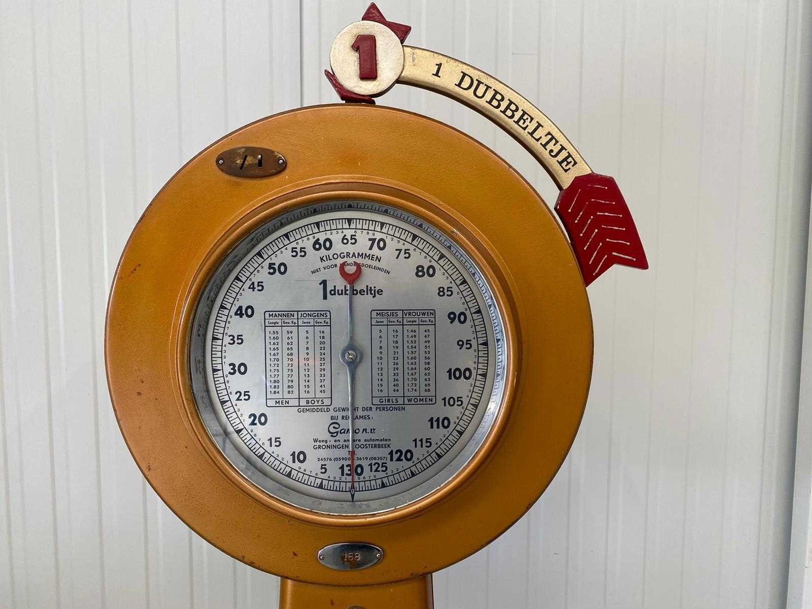 Stationsweegschaal, jaren 70 van de vorige eeuw, werkt op dubbeltjes No Merk: Gamo Hoogte: 185