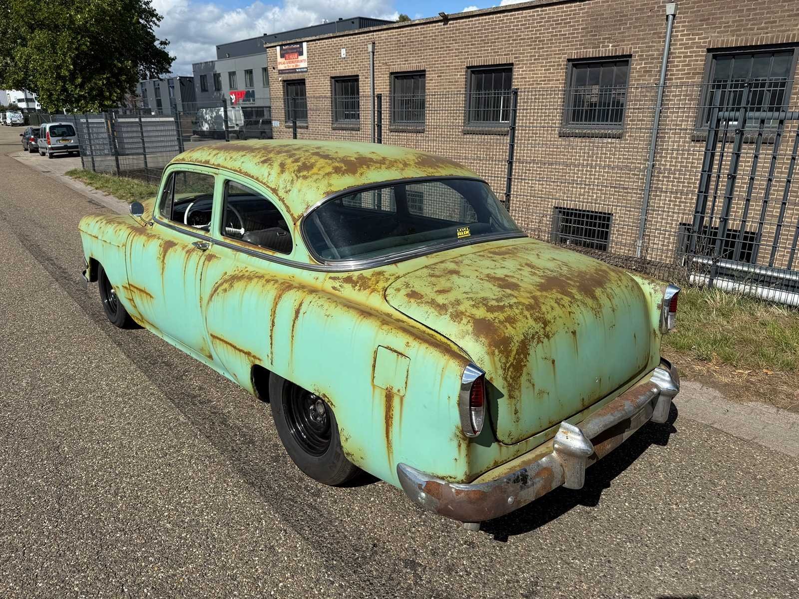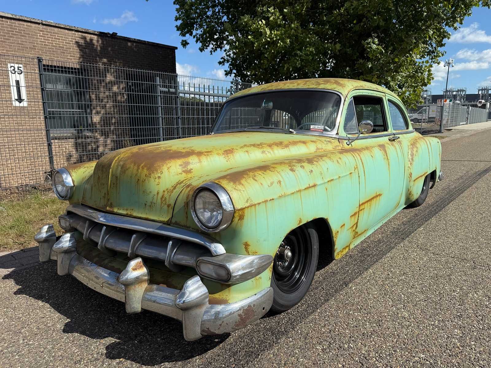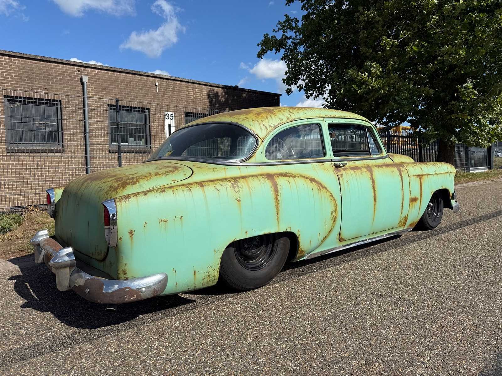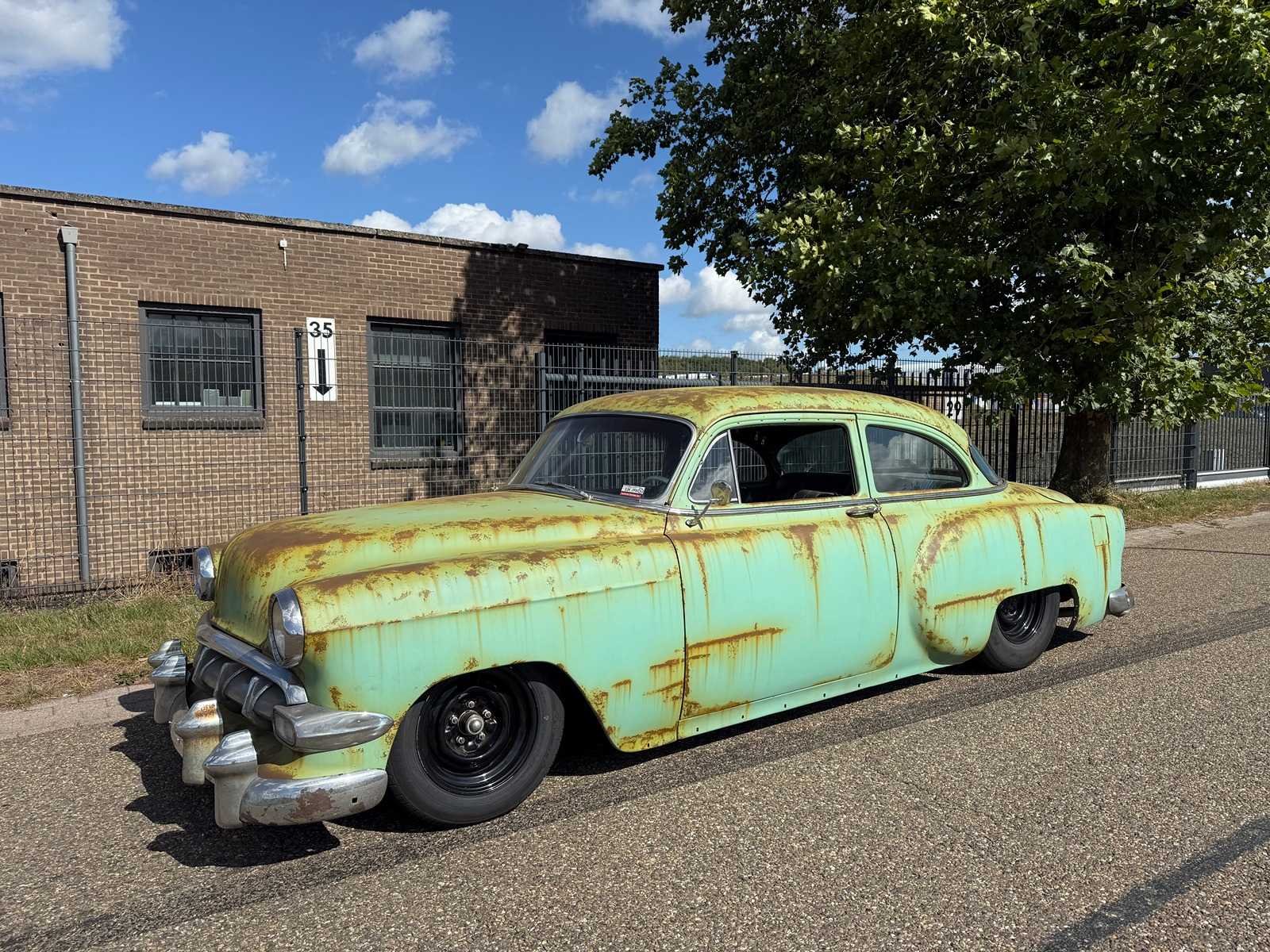Chevrolet 210 (Belair) 2drs coupé uit 1954 met 350ci 5.7L V8 motor en 3 traps automaat. Mustang 2 onafhankelijk geveerde vooras aangelast tegen het originele chasis met rack and pinion stuurhuis en schijfremmen. Achteras is een 10bolt GM met trommelremmen en is met een 4 link ophanging systeem bevestigd. Airride systeem (luchtvering) op alle 4 de wielen apart instelbaar. Auto is volledig in “patina” stijl gespoten dus alles is nagemaakt met lak! Voorzien van USA papieren, en kan tegen betaling ingevoerd worden. Taxen en invoerrechten zijn reeds volbracht, en komen er niet extra bij. Start/rijd en remt maar dient volledig nagekeken te worden en klaargemaakt. Interieur is van een modernere auto en dient afgewerkt te worden. Usa title en invoer papieren erbij, invoerrechten zijn betaald No Chassisnummer: B54S049776 Merk: Chevrolet Model: 210 Brandstof: benzine Datum eerste toelating: 1954 Nationaliteit documenten: USA Carrosserie: Coupe Aandrijving: Rear Transmissie: Automatic Aantal deuren: 2 Stuurwiel: Left Kleur: Patina Cilinderinhoud: 5700 Aantal cilinders: 8
