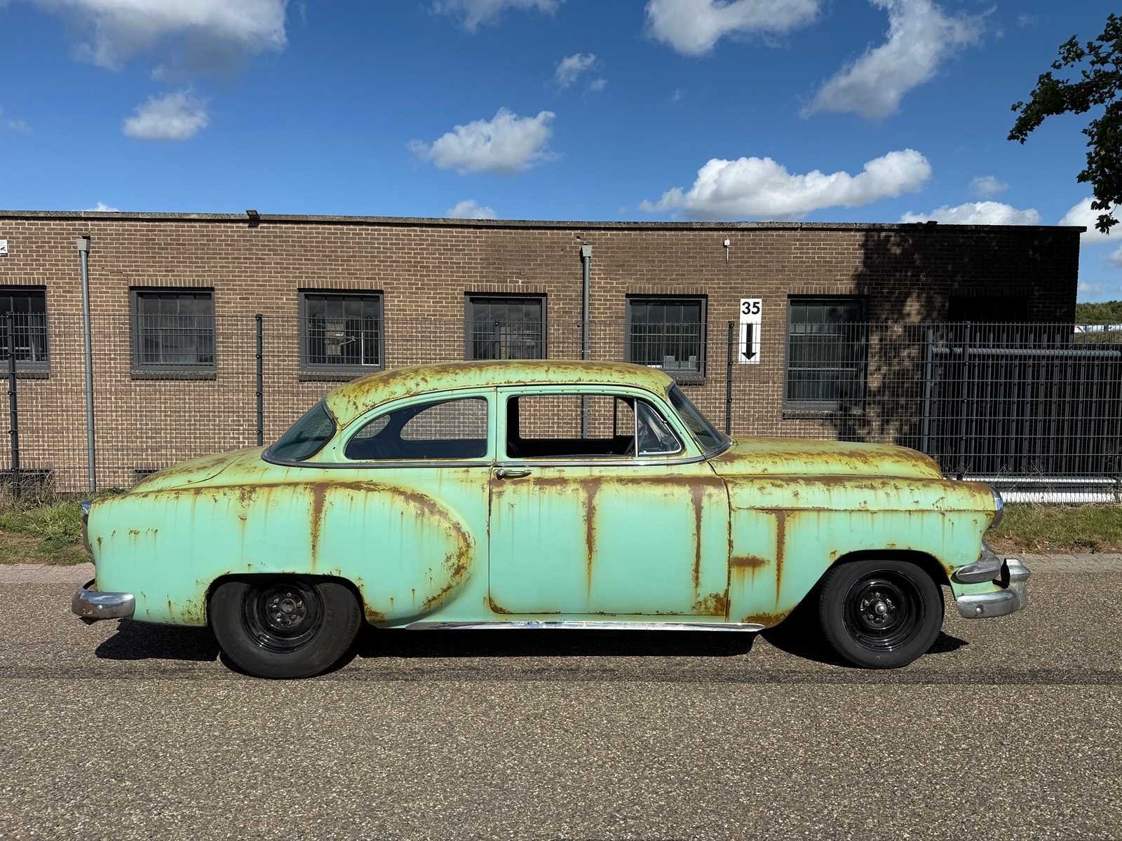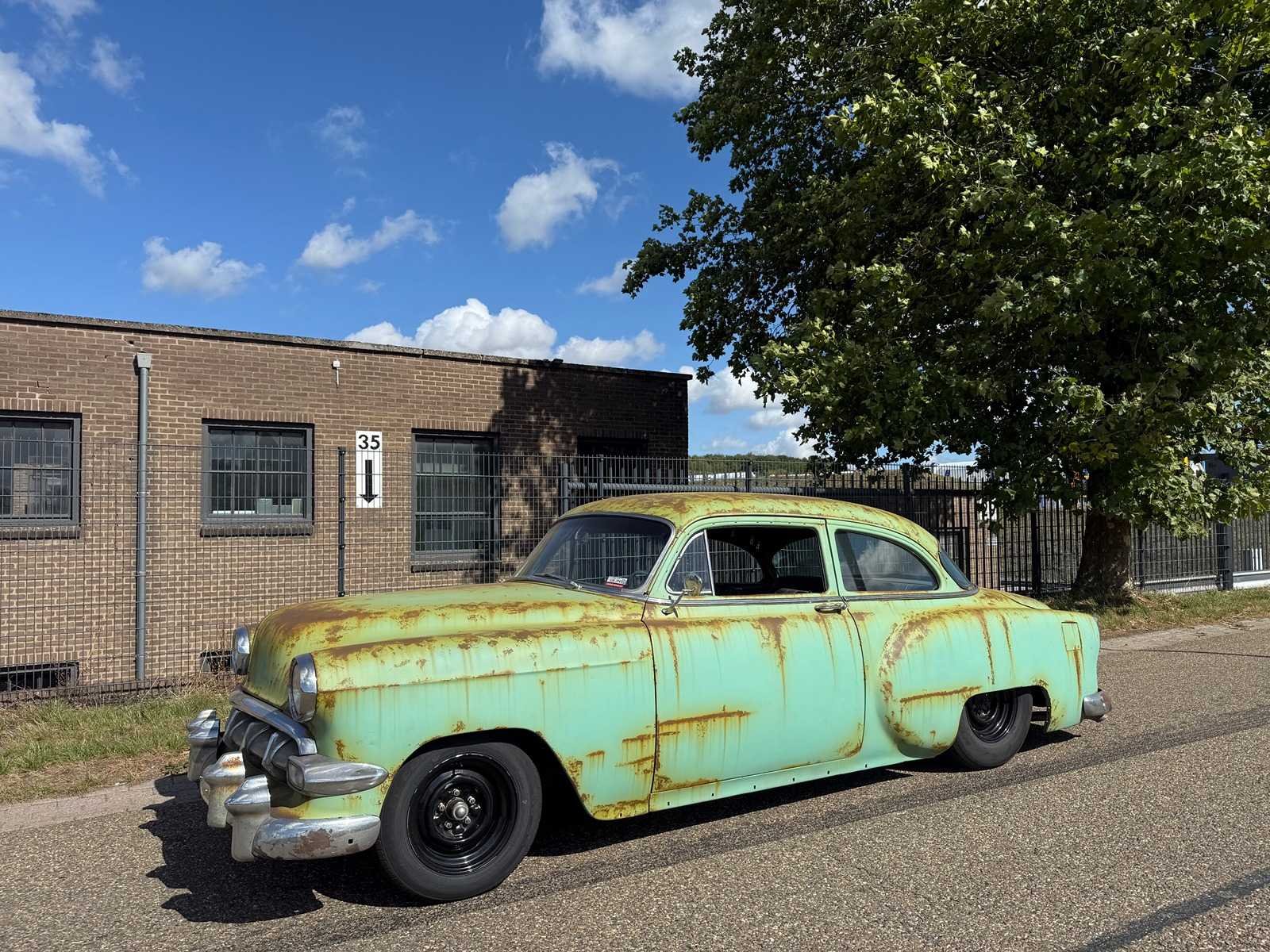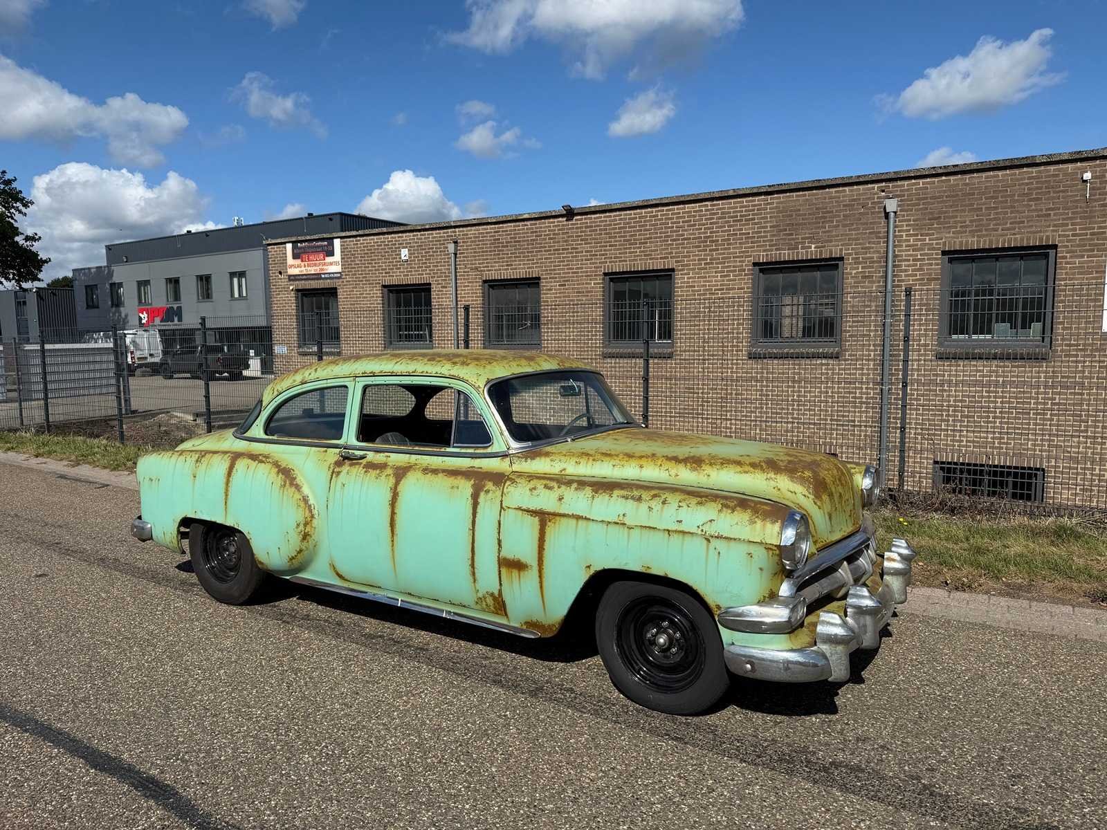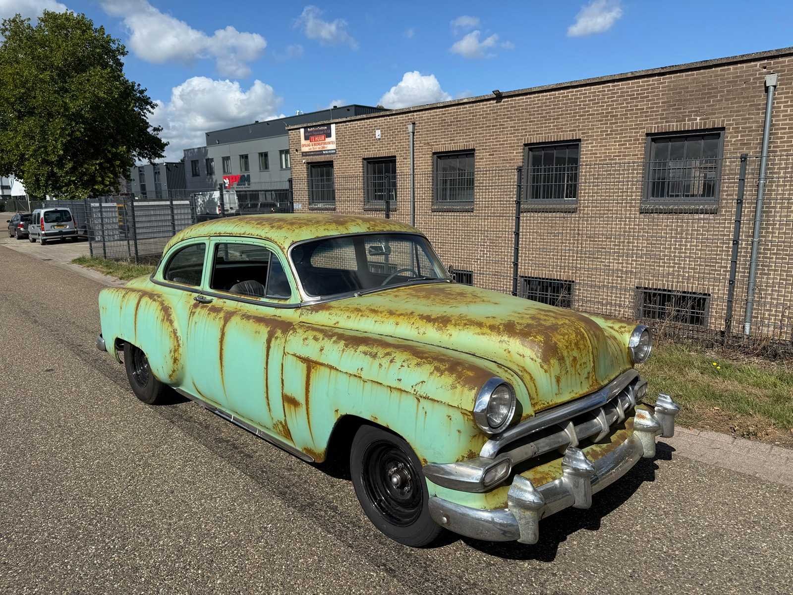 Chevrolet 210 (Belair) 2drs coupé uit 1954 met 350ci 5.7L V8 motor en 3 traps automaat. Mustang 2 onafhankelijk geveerde vooras aangelast tegen het originele chasis met rack and pinion stuurhuis en schijfremmen. Achteras is een 10bolt GM met trommelremmen en is met een 4 link ophanging systeem bevestigd. Airride systeem (luchtvering) op alle 4 de wielen apart instelbaar. Auto is volledig in “patina” stijl gespoten dus alles is nagemaakt met lak! Voorzien van USA papieren, en kan tegen betaling ingevoerd worden. Taxen en invoerrechten zijn reeds volbracht, en komen er niet extra bij. Start/rijd en remt maar dient volledig nagekeken te worden en klaargemaakt. Interieur is van een modernere auto en dient afgewerkt te worden. Usa title en invoer papieren erbij, invoerrechten zijn betaald No Chassisnummer: B54S049776 Merk: Chevrolet Model: 210 Brandstof: benzine Datum eerste toelating: 1954 Nationaliteit documenten: USA Carrosserie: Coupe Aandrijving: Rear Transmissie: Automatic Aantal deuren: 2 Stuurwiel: Left Kleur: Patina Cilinderinhoud: 5700 Aantal cilinders: 8