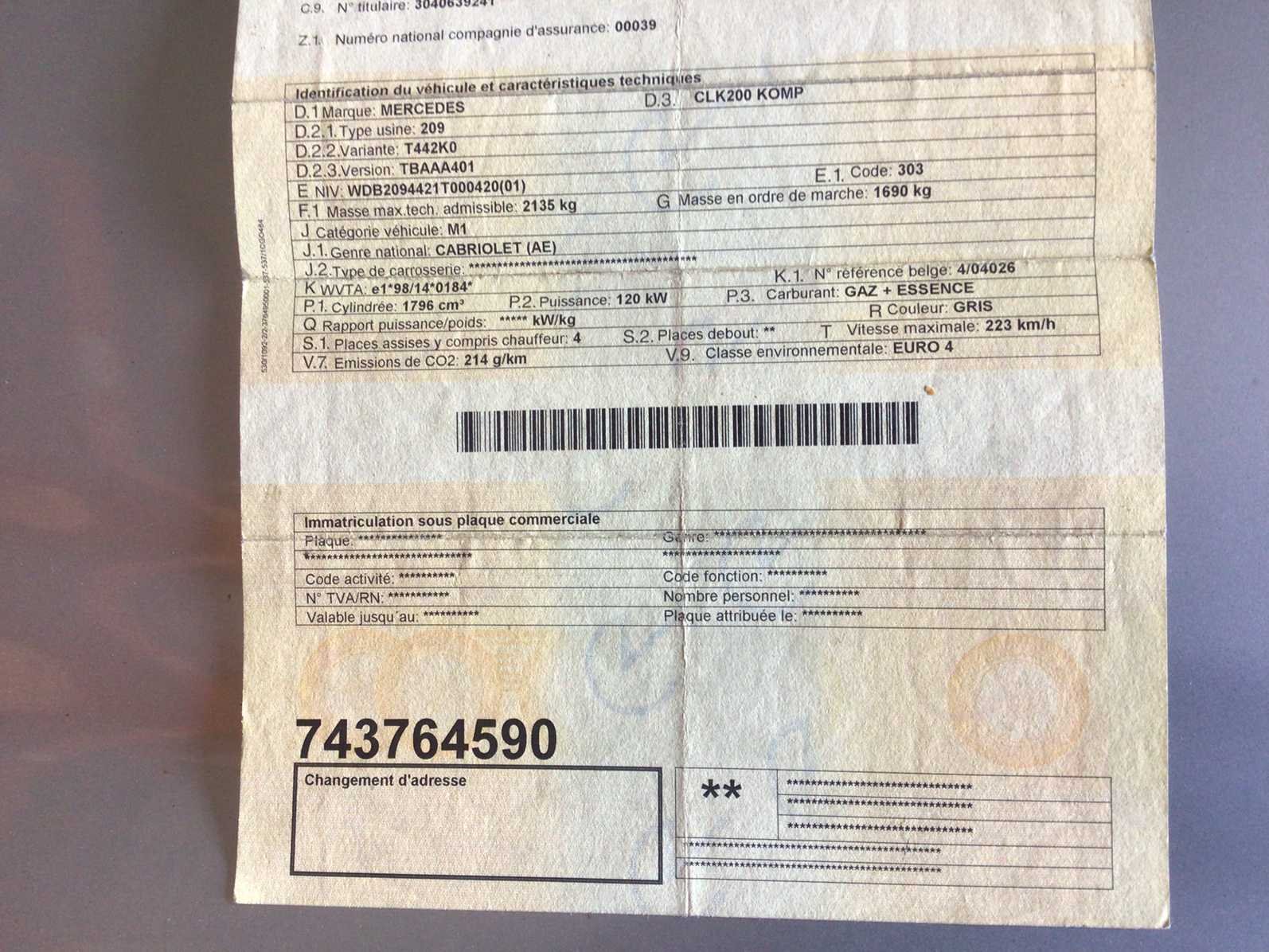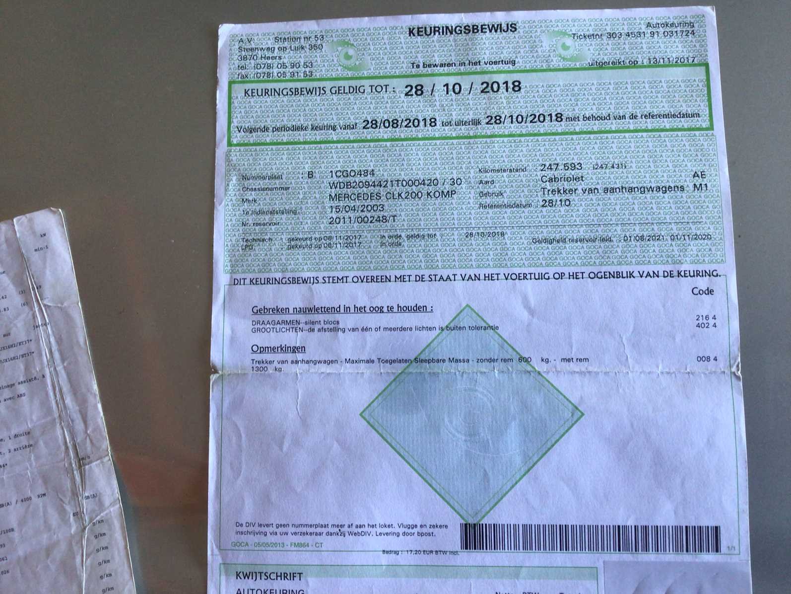 Wat gebruikssporen, winteruitrusting Non Merk: Mercedes-Benz Model: CLK200 Type: Cabriolet Bouwjaar: 2003 Afgelezen kilometerstand: 257600km Cilinderinhoud: 1800cc Brandstof: Benzine Kleur: Grijs Gasinstallatie: true Gelijkvormigheidsattest aanwezig: true Zichtbare schade: Klauw Airconditioning: true Leder bekleed: true Inschrijvingsbewijs - deel 1 : Oké Inschrijvingsbewijs - deel 2: Oké
