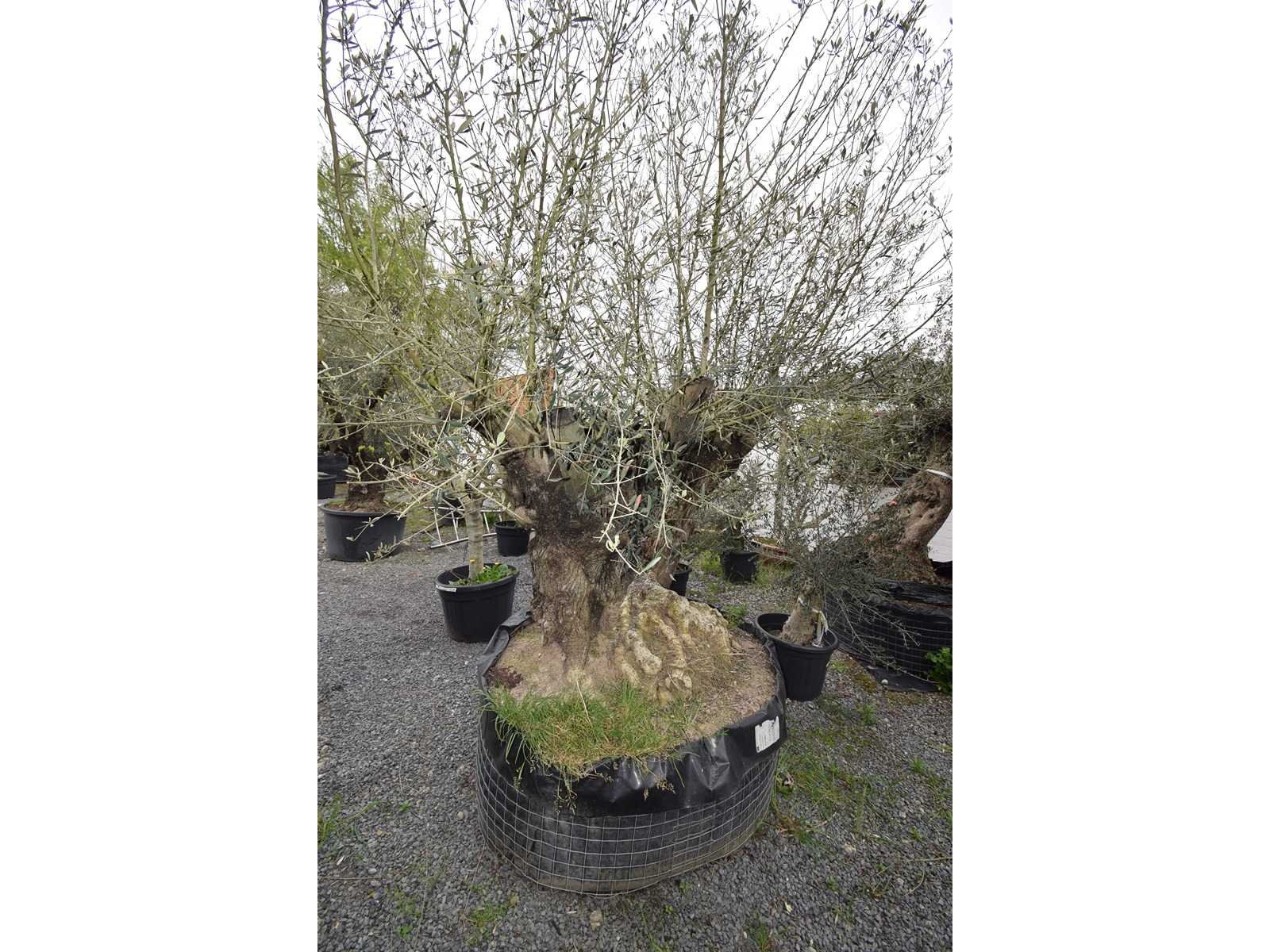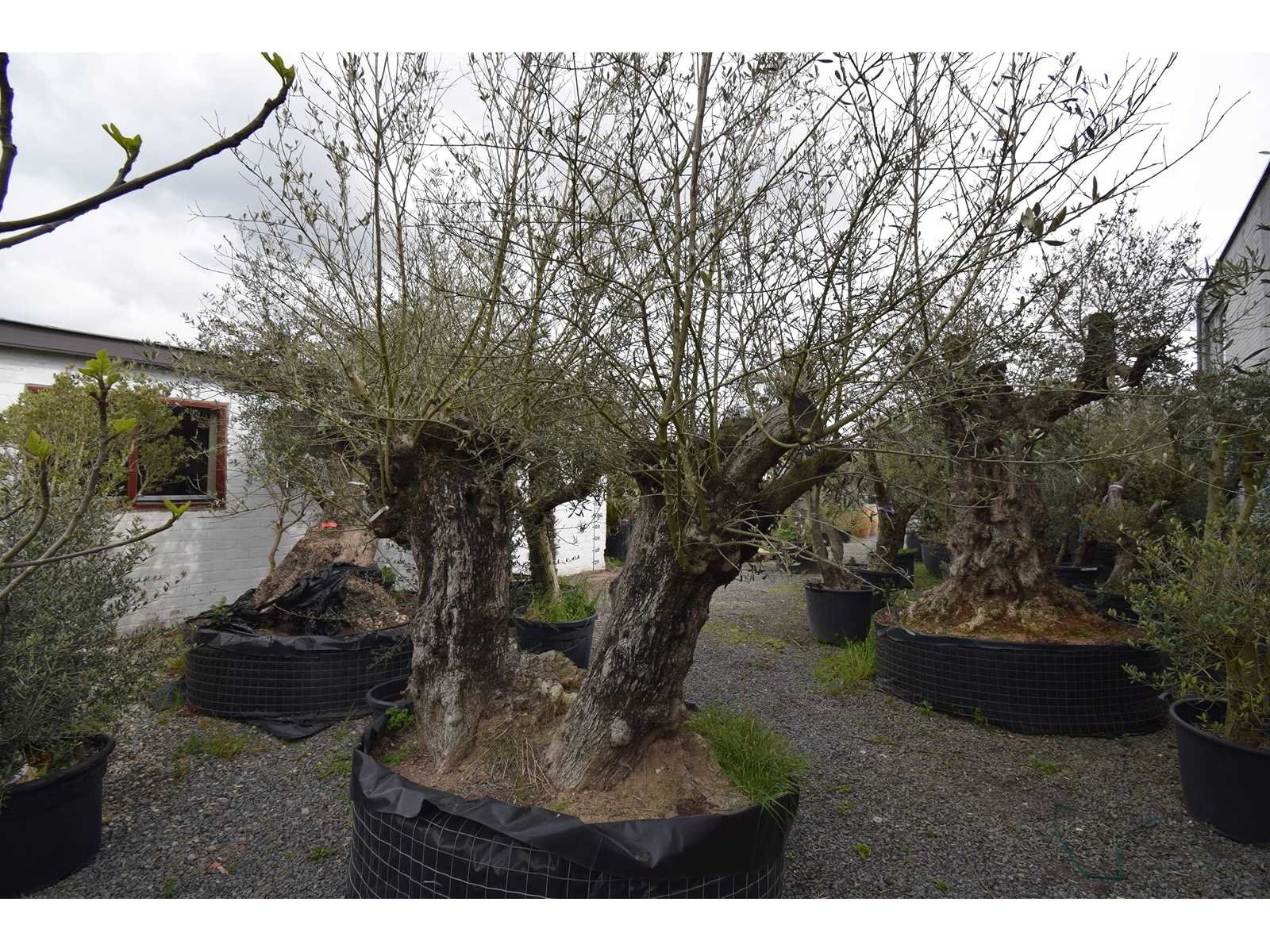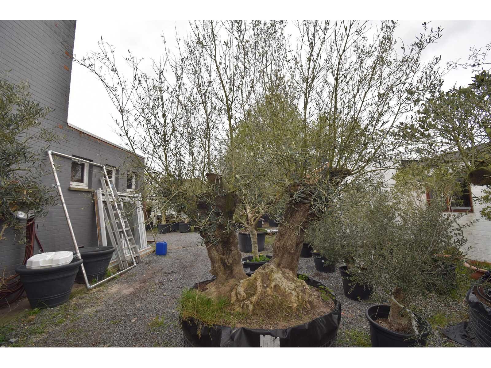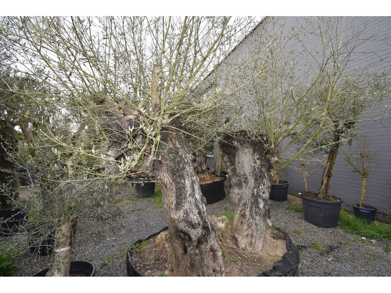 Dubbelstammige olijfboom , totale hoogte 340cm , totale breedte 290cm, totale diepte 180 cm No Type: dubbel trunk old skin Latijnse benaming: olea europaea Hoogte ca.: 340cm In pot: true Stamdikte: 40cm Leeftijd: 220 Eigen gewicht: 355