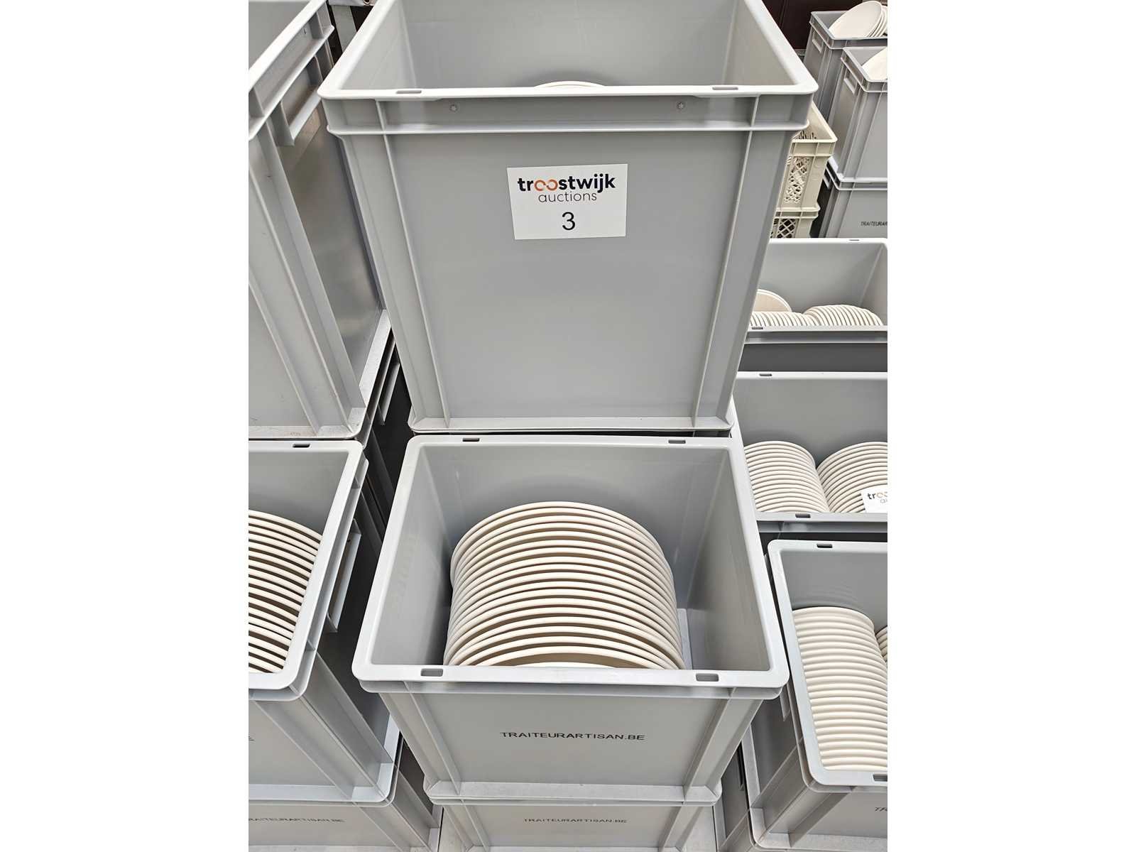 5 transportbakken inhoudende plm 100 dekborden, kleur wit Nee Merk: Bonna Type: dekbord Diameter ca.: 30