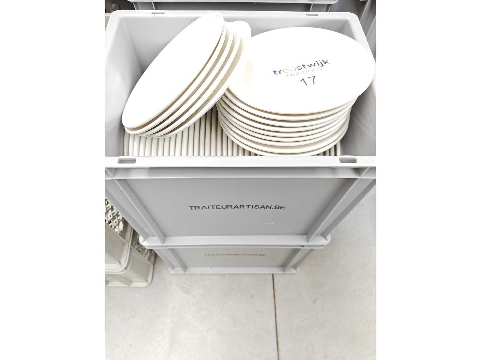 2 transportbakken inhoudende plm 100 dessertborden, kleur wit Nee Merk: Bonna Type: Dessertbord Diameter ca.: 21