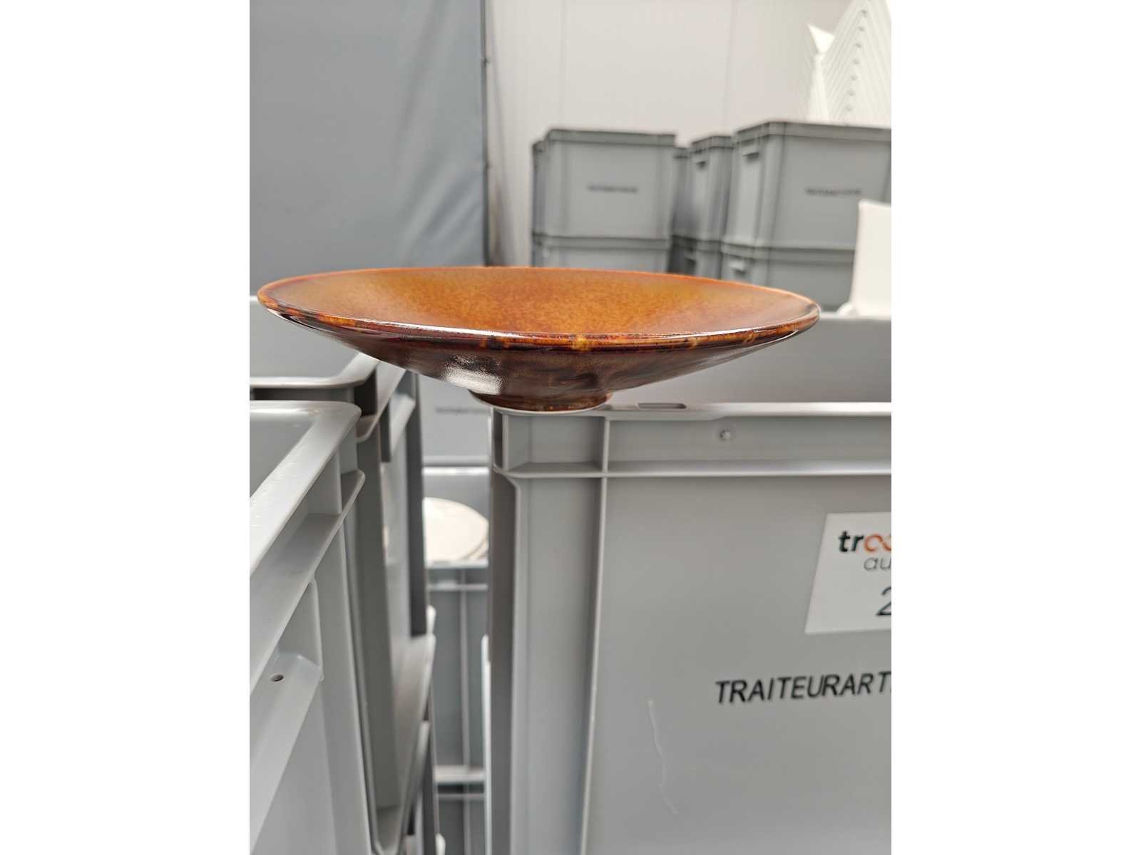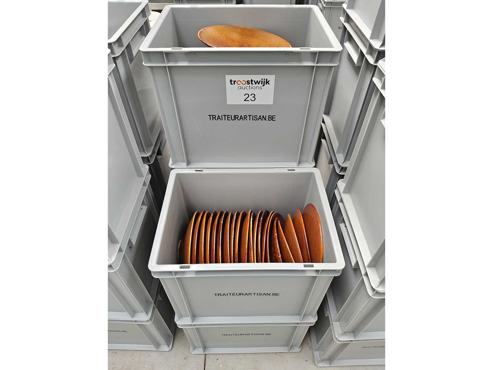 5 transportbakken inhoudende plm 100 borden, kleur donkerbruin Nee Merk: F2D Type: Diep bord Diameter ca.: 23