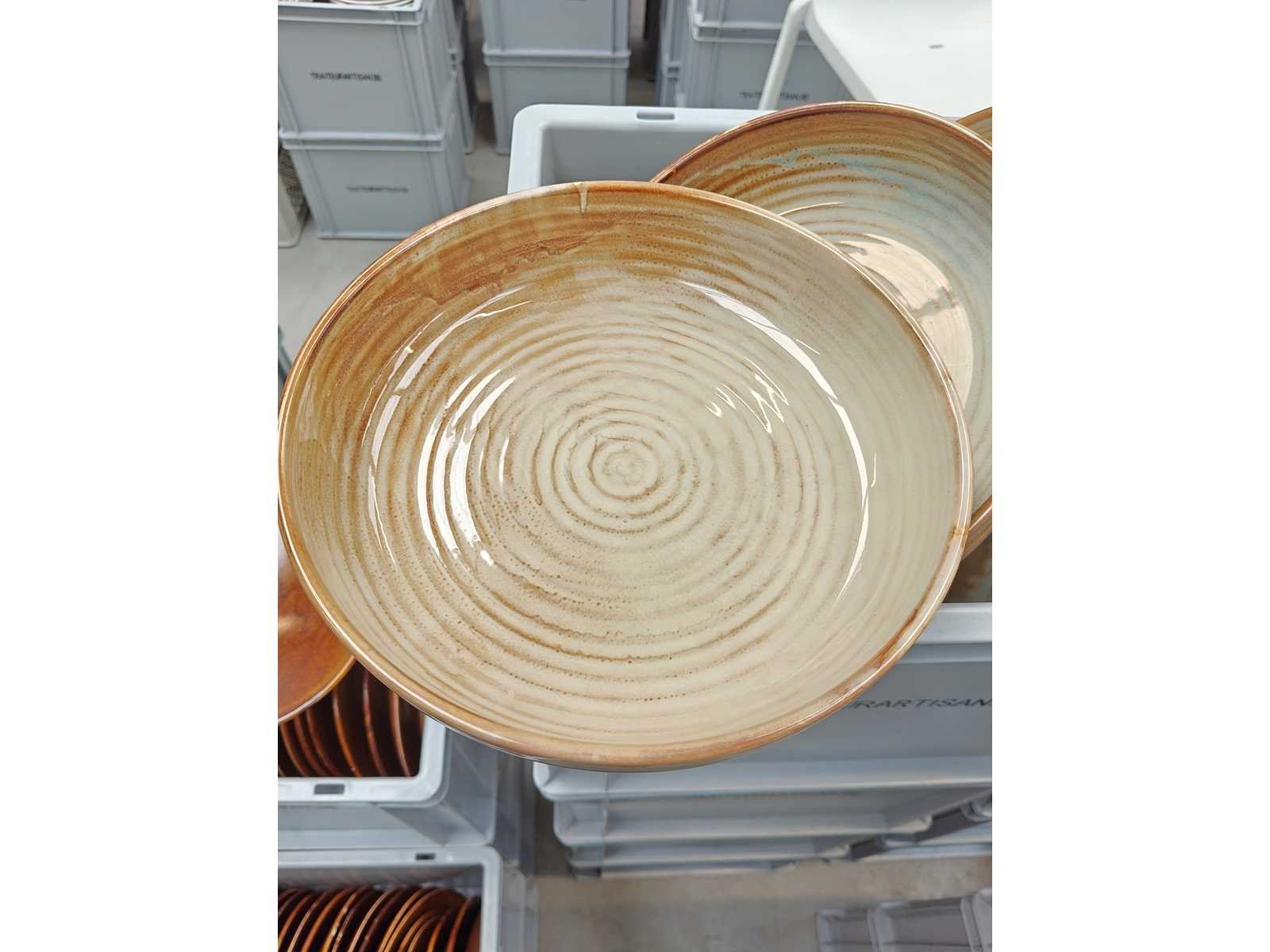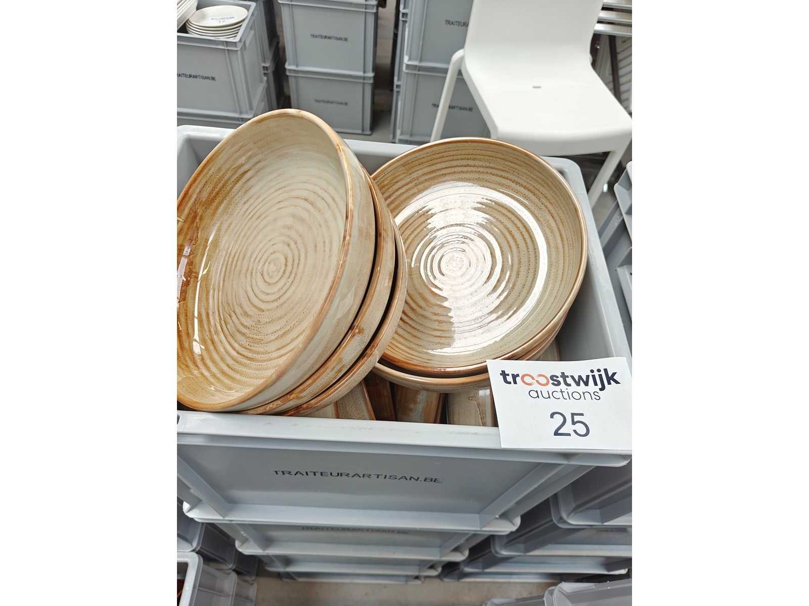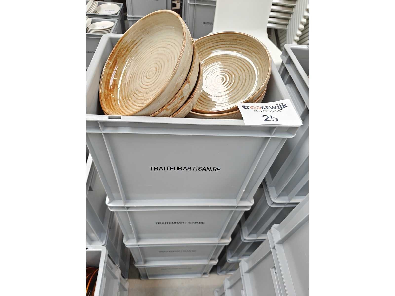 4 transportbakken inhoudende plm 106 borden, kleur lichtbruin Nee Merk: F2D Type: Diep bord Diameter ca.: 22
