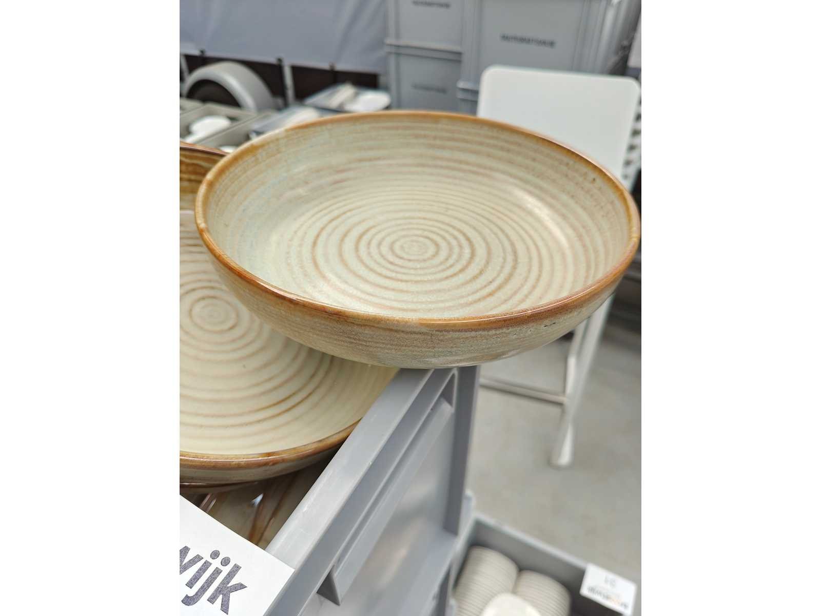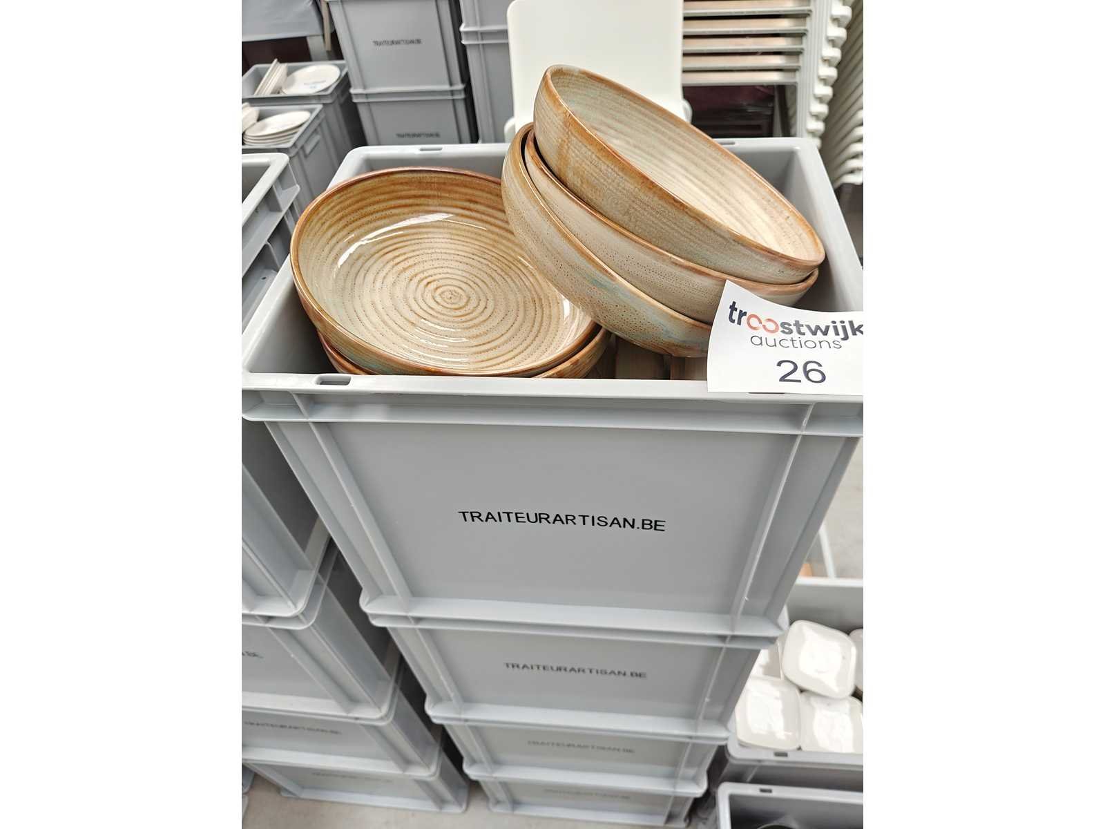 4 transportbakken inhoudende plm 106 borden, kleur lichtbruin Nee Merk: F2D Type: Diep bord Diameter ca.: 22