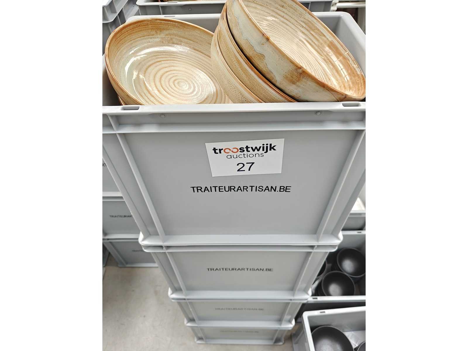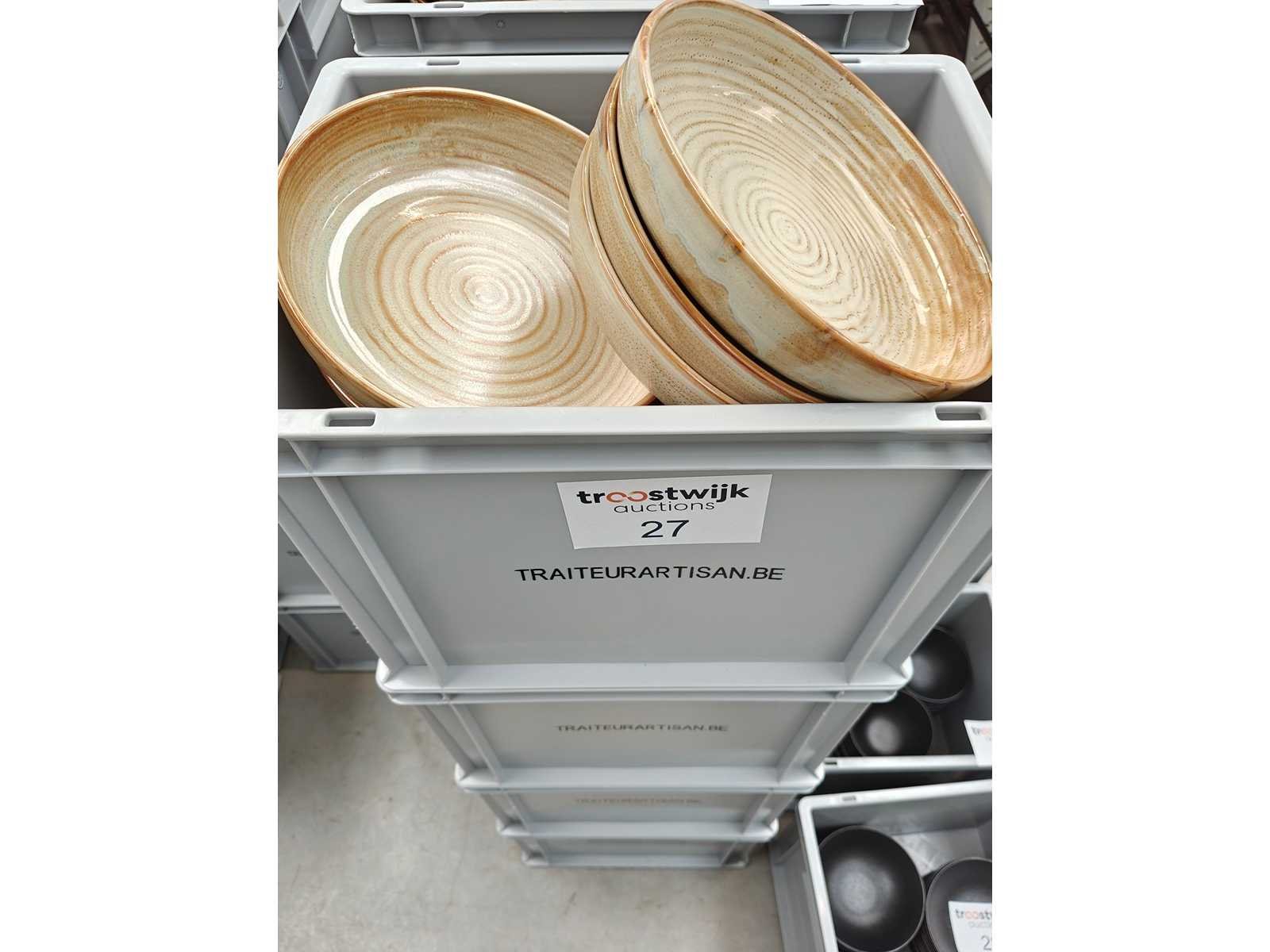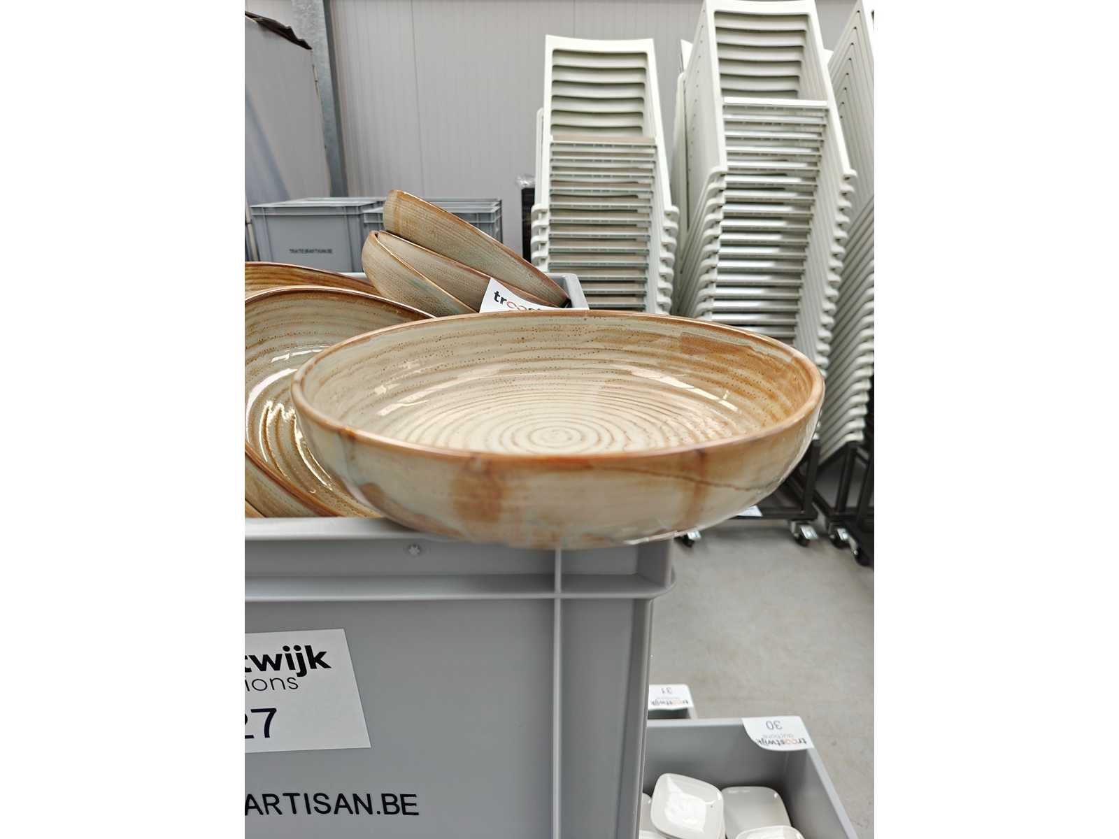 4 transportbakken inhoudende plm 106 borden, kleur lichtbruin Nee Merk: F2D Type: Diep bord Diameter ca.: 22
