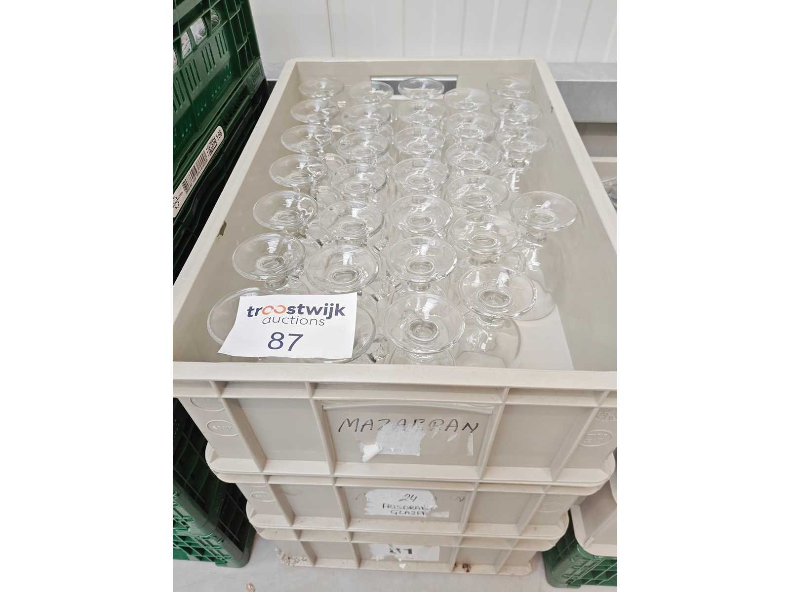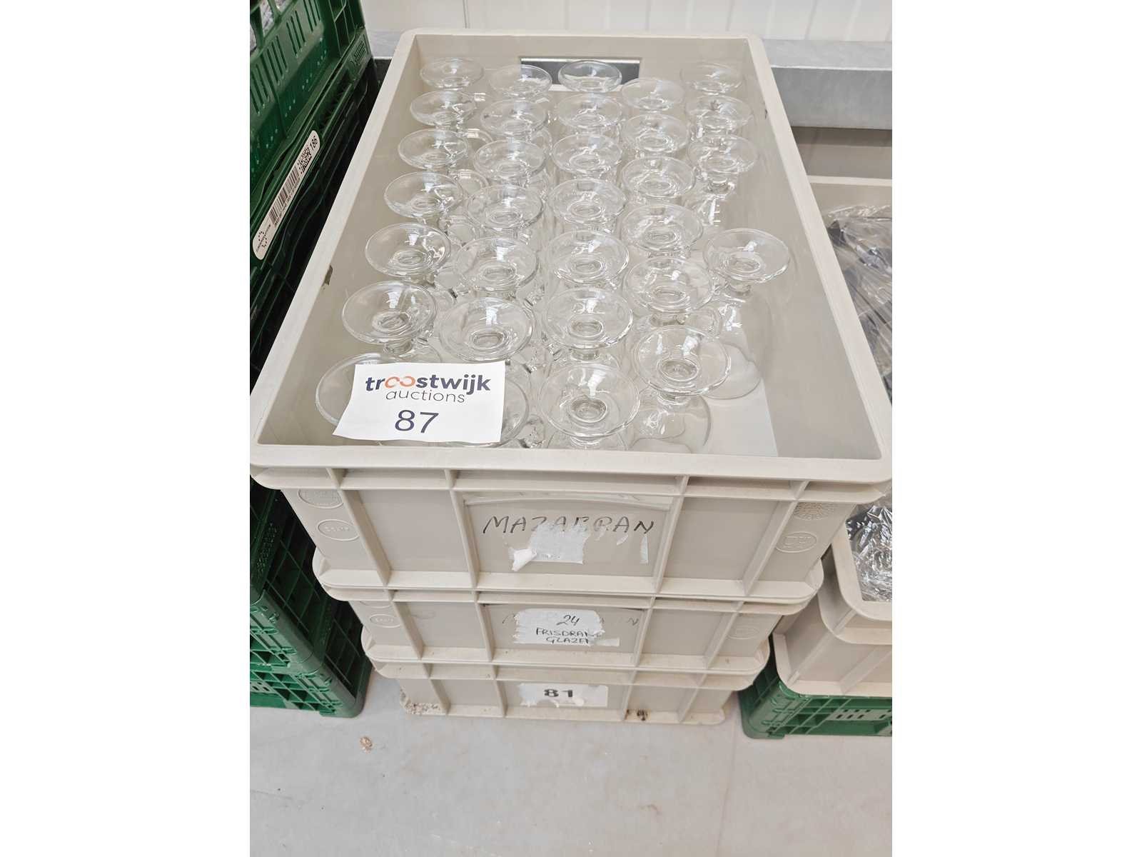 3 transportbakken inhoudende plm 95 theeglazen op voet Nee Totale afmeting Hoogte: 13.5cm Diameter ca.: 7.50