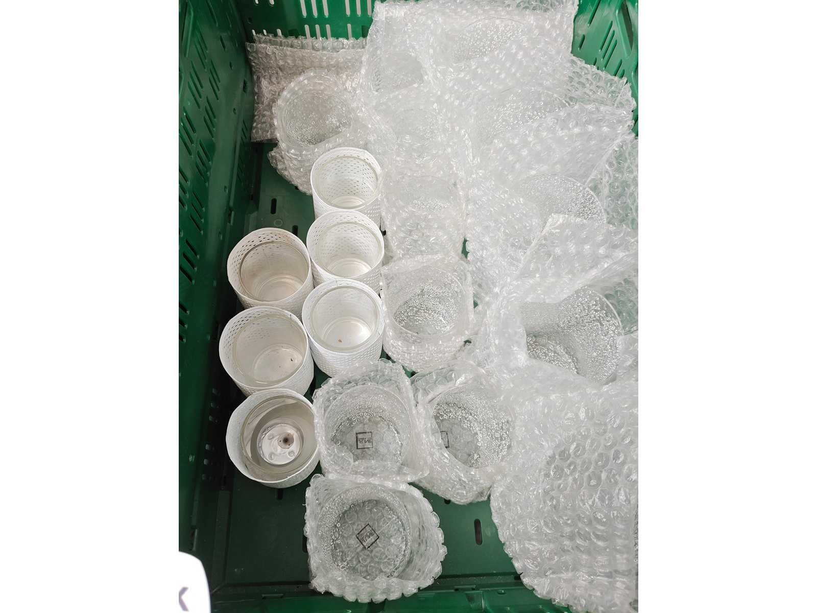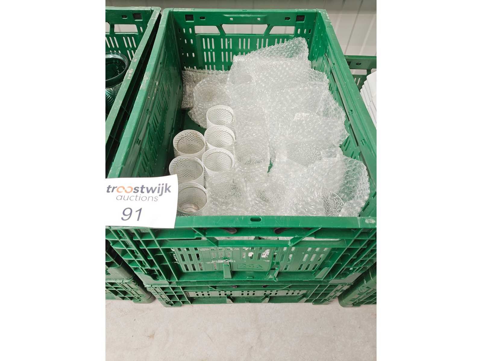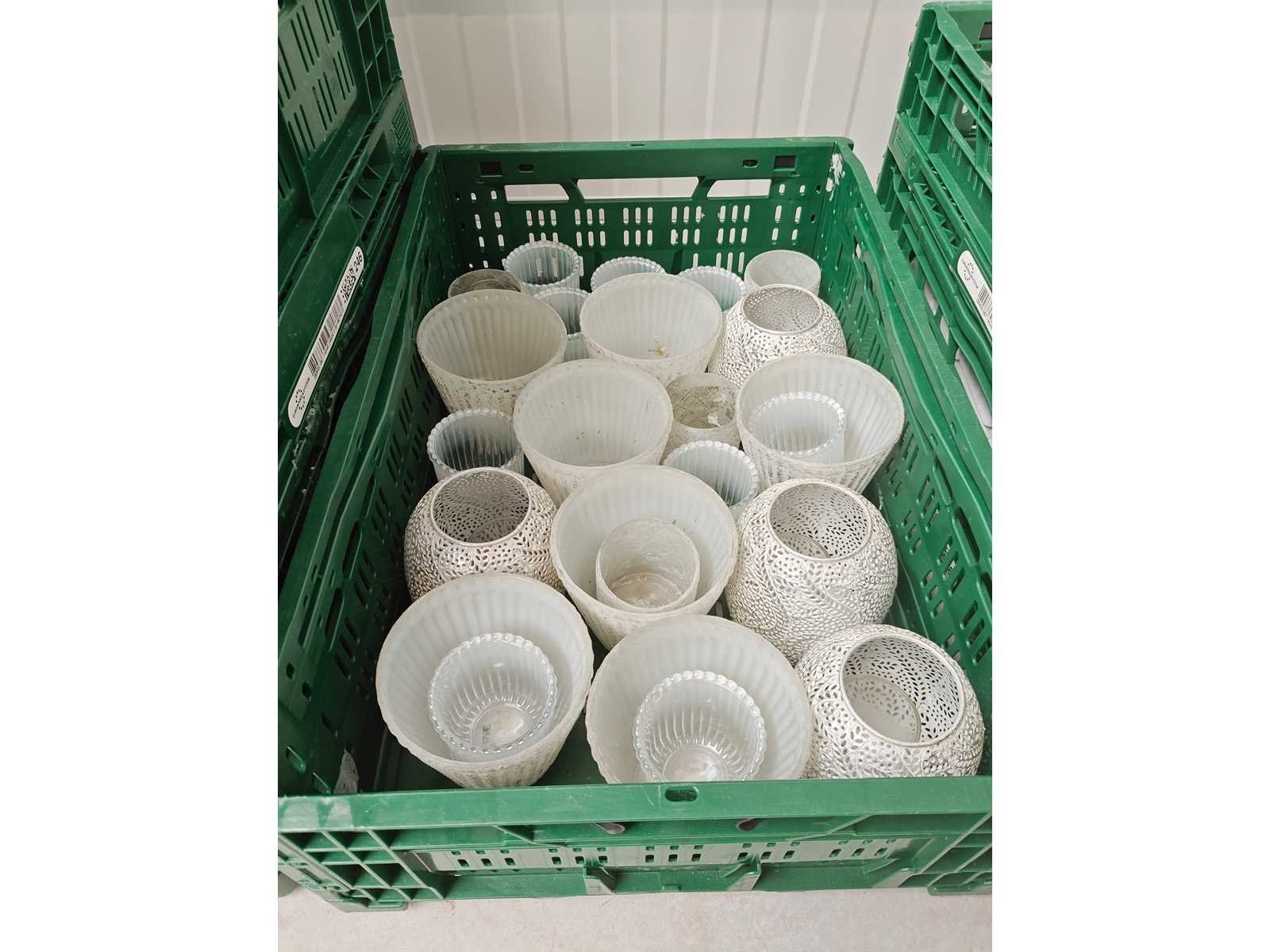 2 transportbakken inhoudende partij kaarshouders plm 43 stuks, kleur wit/transparant, diverse formaten Nee Kleur: wit/transparant