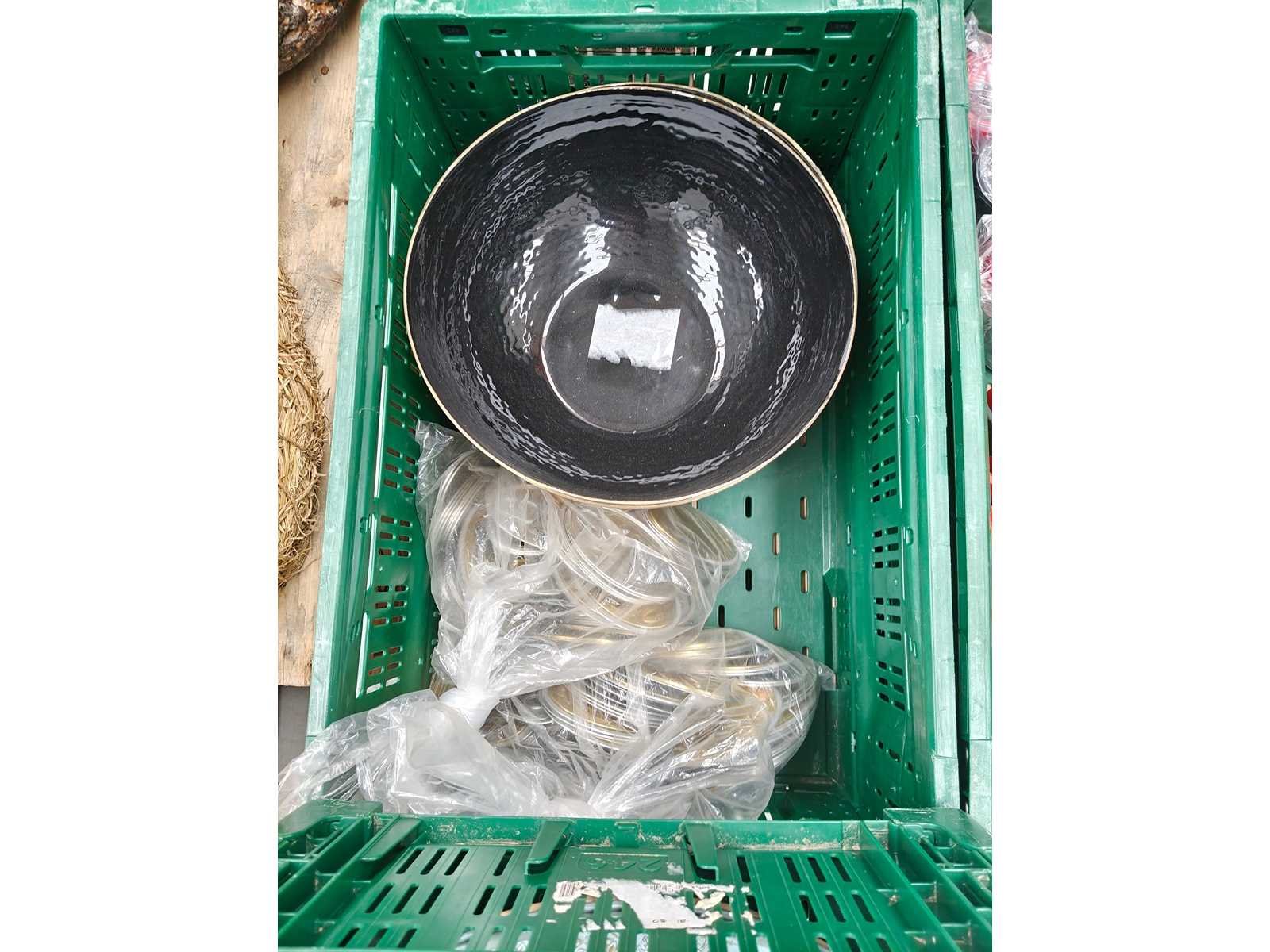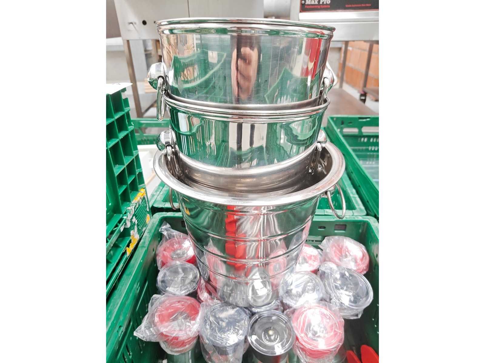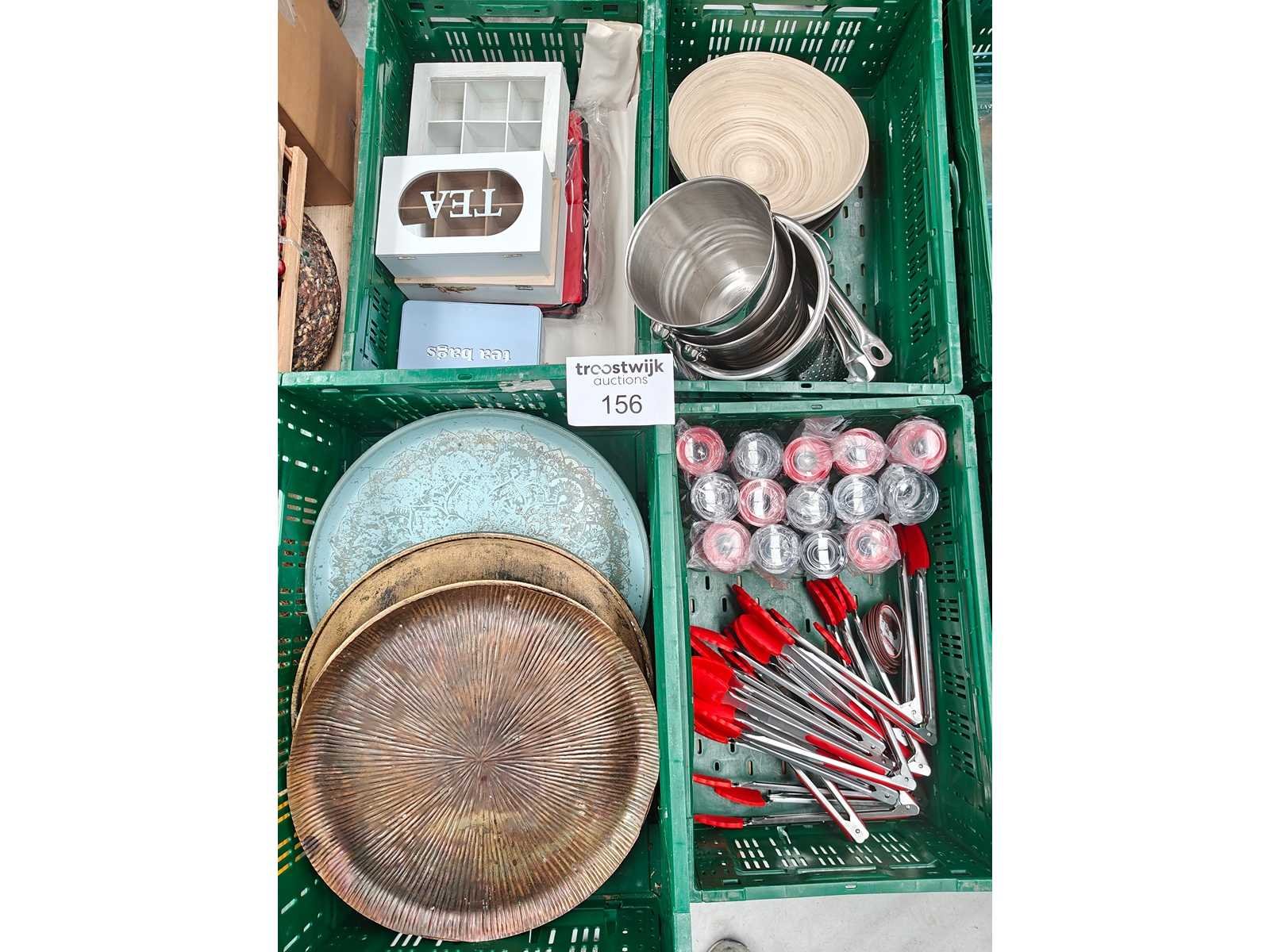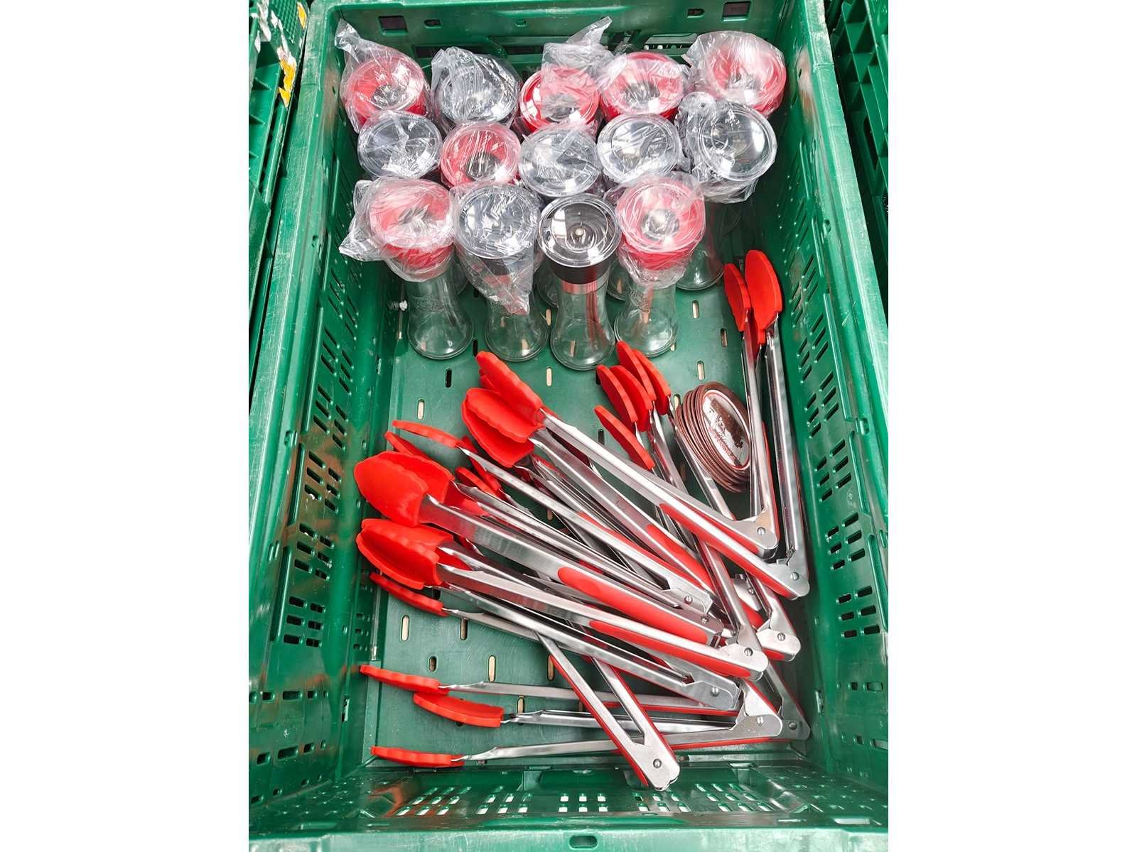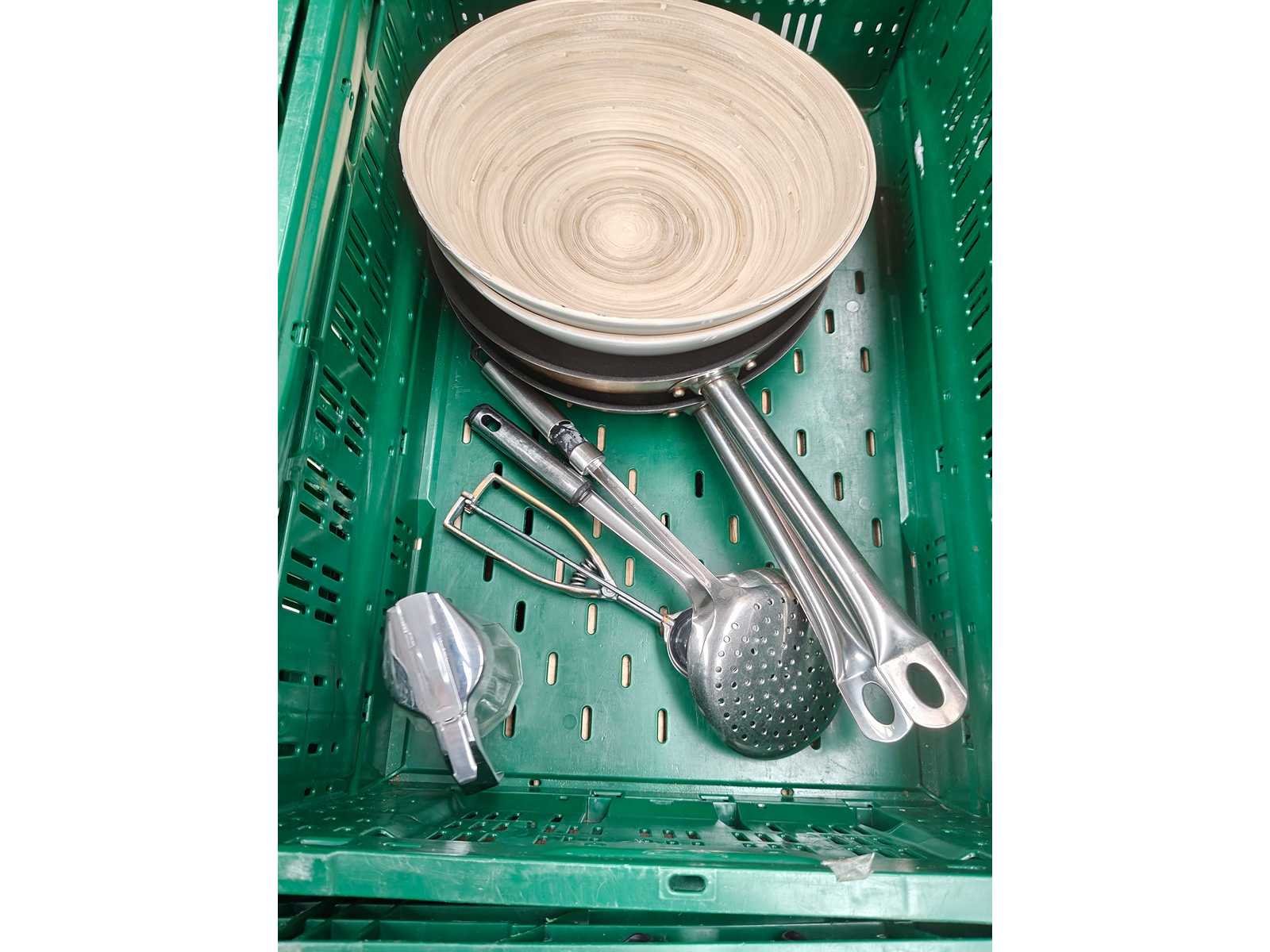 Pallet inhoudende 5 transportbakken met divers keukenmateriaal waaronder serveertangen, peper/zout vatjes, 3 inox ijsemmers, pannen, serveerschalen en theedozen Pallet niet inbegrepen Nee