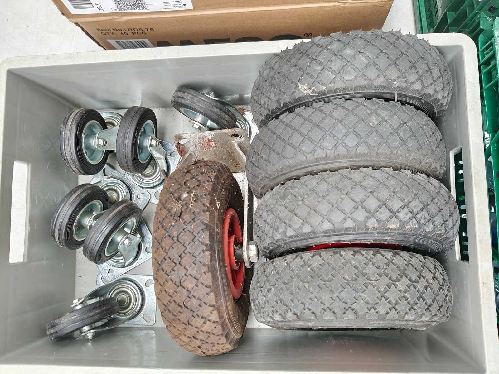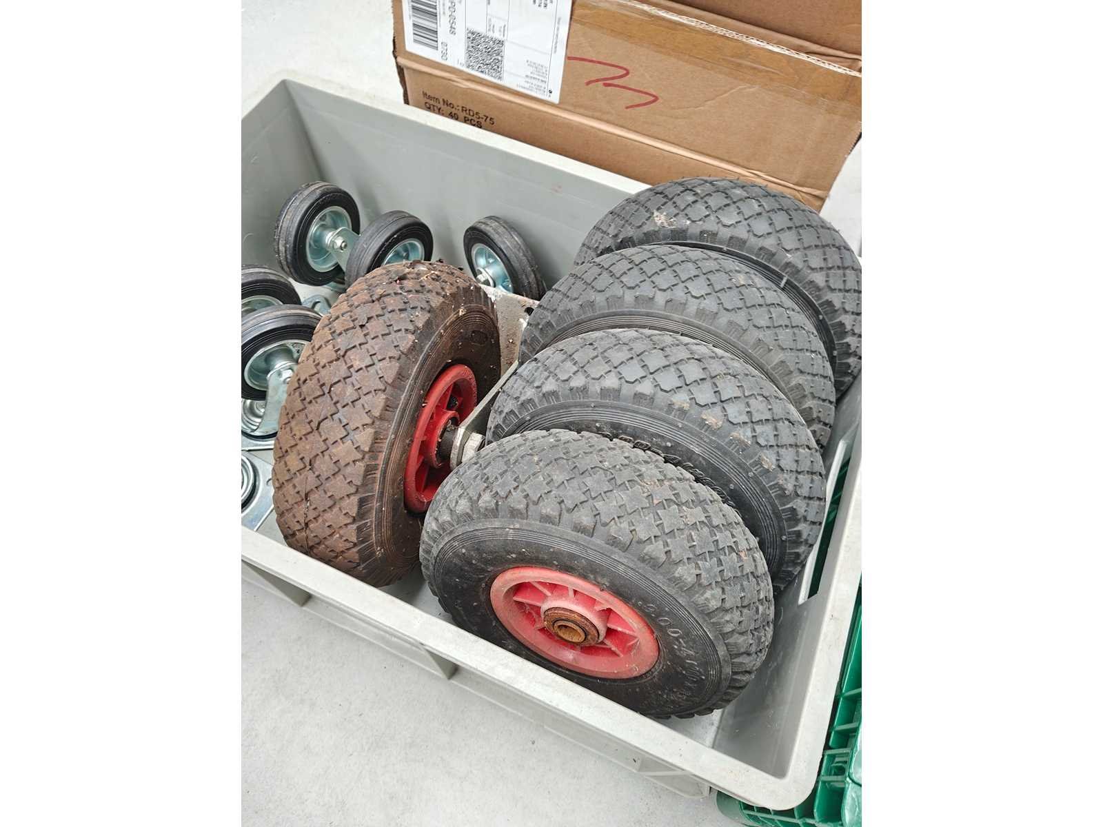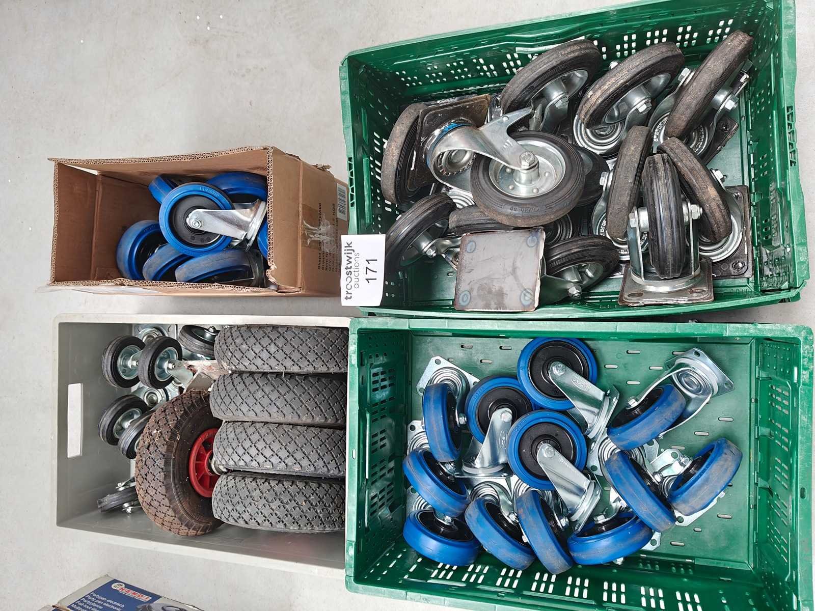 3 transportbakken inhoudende partij wielen waaronder 20 zwenkwielen blauw 125x38 en 12 zwenkwielen 160x40-80 en 6 zwenkwielen 100/30-50 en 5 bolderkarwielen/luchtwielen Nee