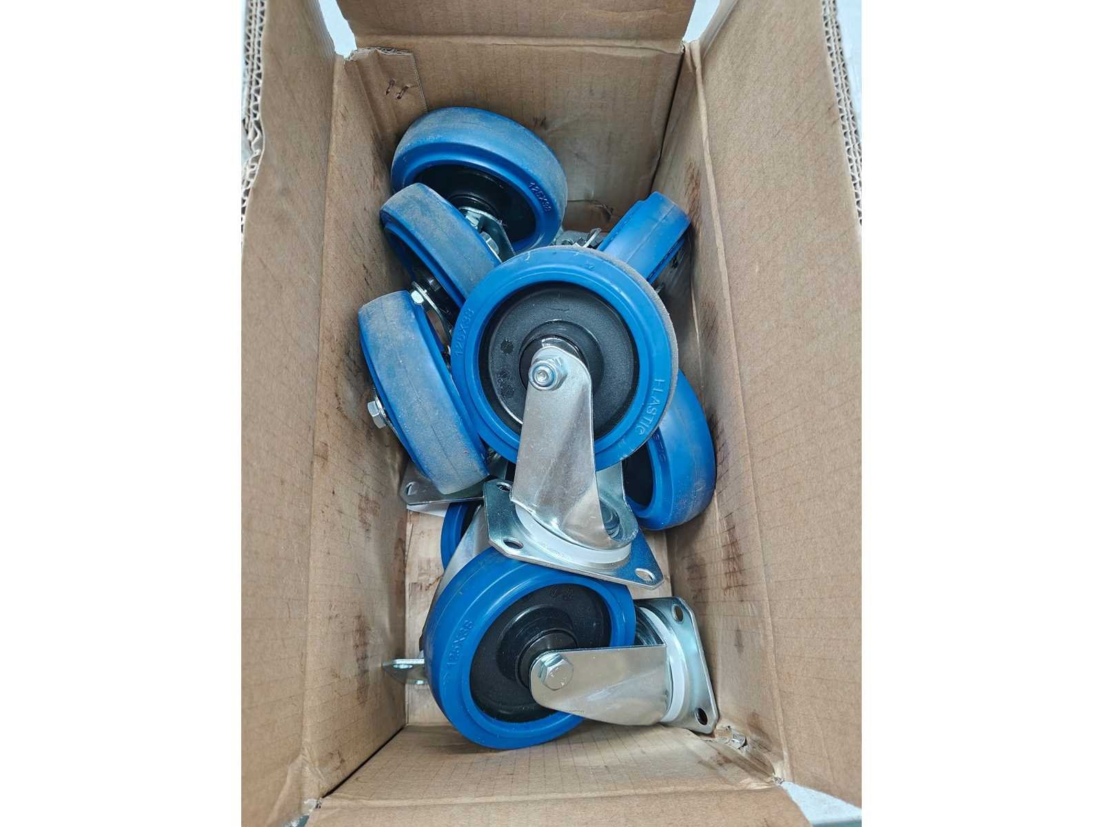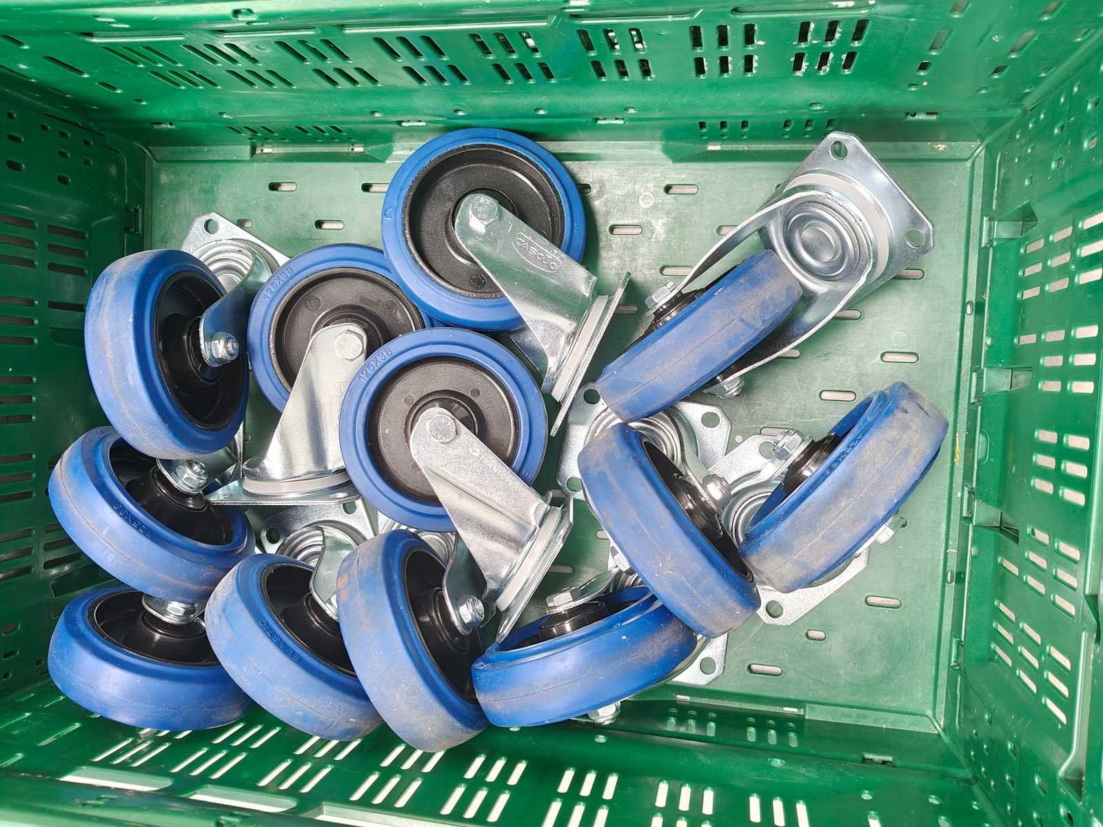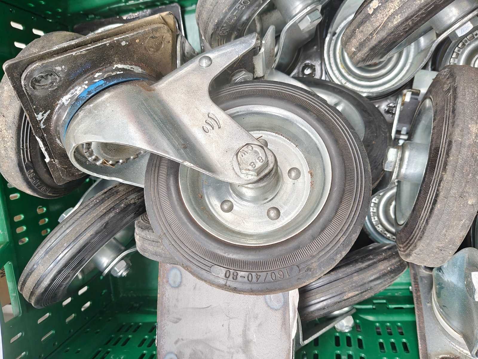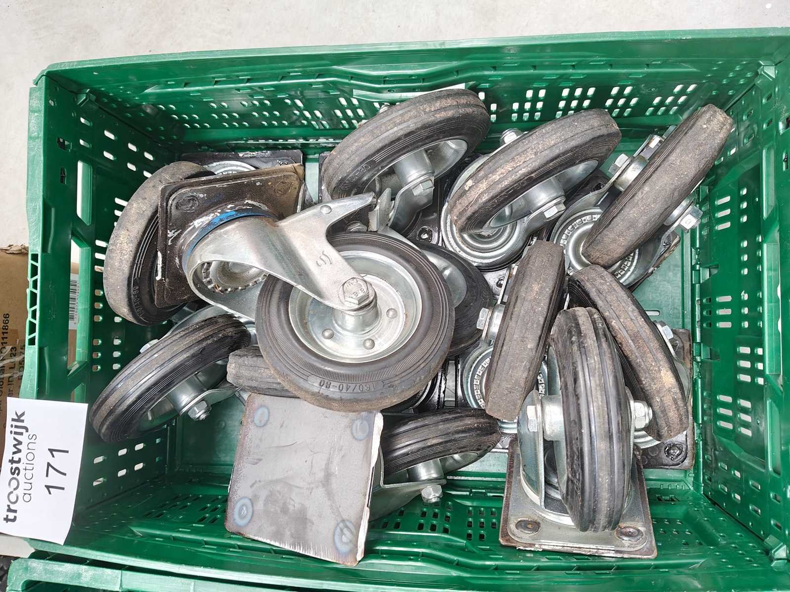3 transportbakken inhoudende partij wielen waaronder 20 zwenkwielen blauw 125x38 en 12 zwenkwielen 160x40-80 en 6 zwenkwielen 100/30-50 en 5 bolderkarwielen/luchtwielen Nee