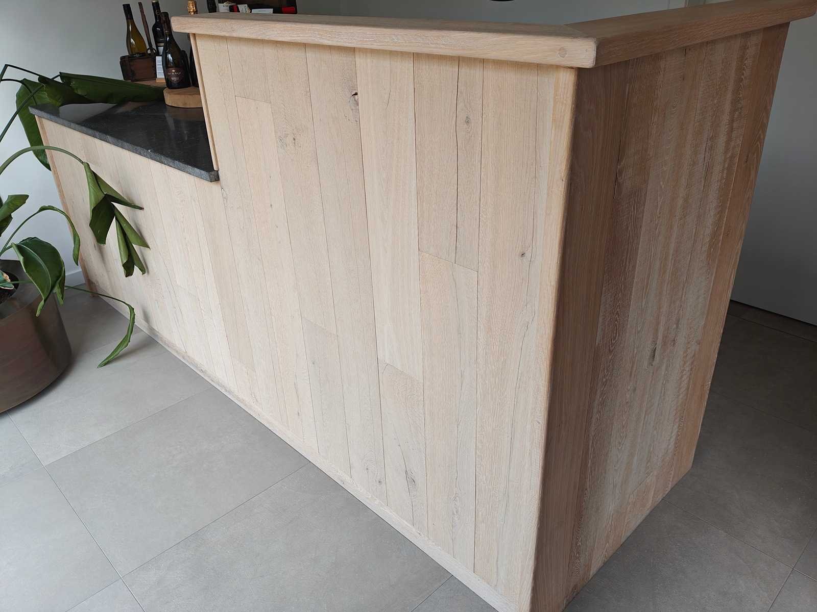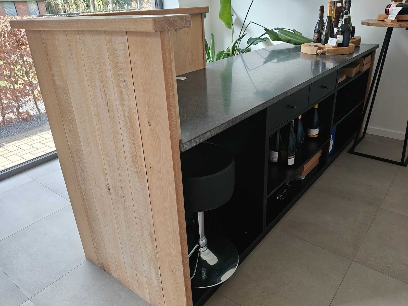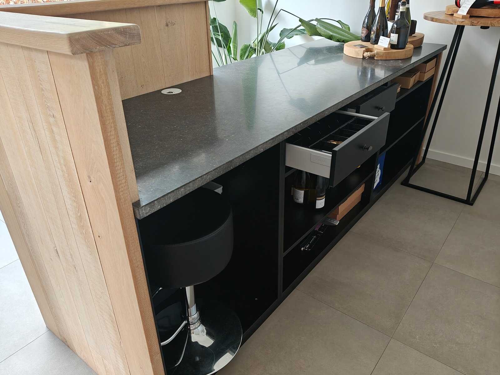 Winkeltoonbank, rondom afgewerkt in massief eik, bovenaan afgewerkt met granieten werkblad dikte cm. Achteraan open kasten voor opberging en 2 schuiven. afmetingen: lengte 265cm, breedte 85cm, hoogte t.e.m. granietenblad 90cm, hoogte inclusief deels opstaande rand in massief eik 127cm. Nee Afmeting l: 2650mm Afmeting b: 850mm Afmeting h: 1270mm