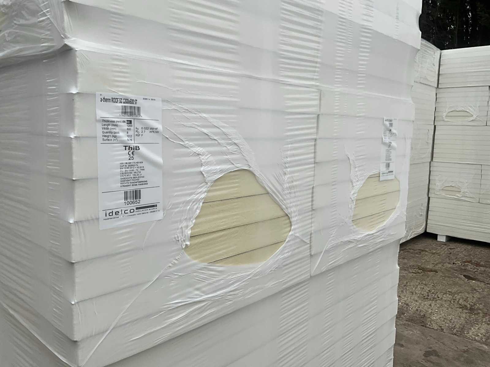 Therm insulation boards 6 cm dikte, in verpakking, per 80 (10 pakken x8) exemplaren op pallet, telkens 8 stuks in een pak. 1 pak = voor 5,76 m2, totaal pallet = 57,60 m2. No Merk: IDELCO Product type: Therm Roof 60 mm Lengte: 120cm Breedte: 60cm Hoogte: 6cm