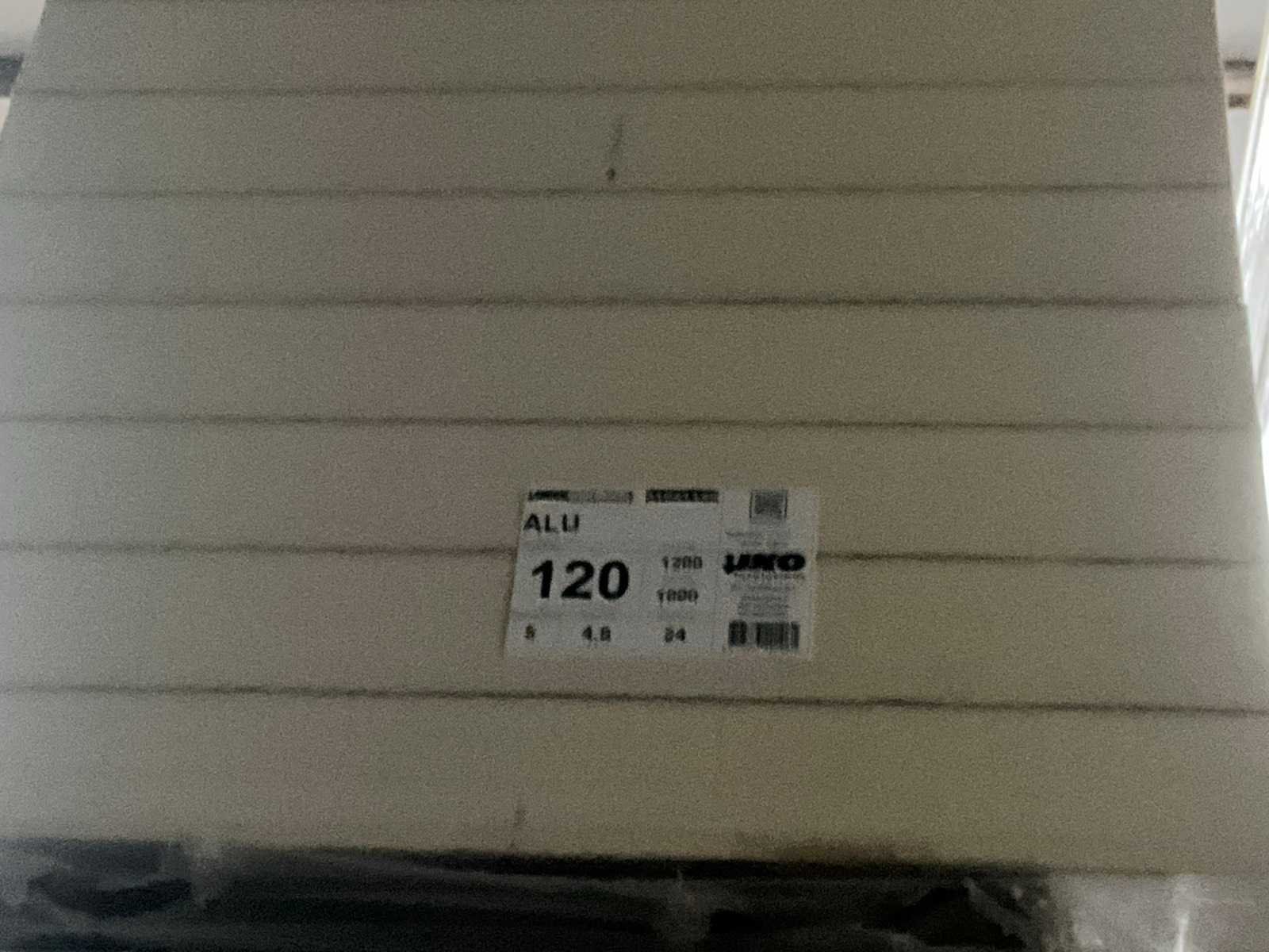 Thermal insulation (PIR) 12 cm dikte, in verpakking, per 20 (5 pakken x4) exemplaren op pallet, telkens 4 stuks in een pak. 1 pak = voor 4,80 m2, totaal pallet = 24 m2. No Merk: IKO Product type: Enertherm ALU Lengte: 120cm Breedte: 100cm Hoogte: 12cm