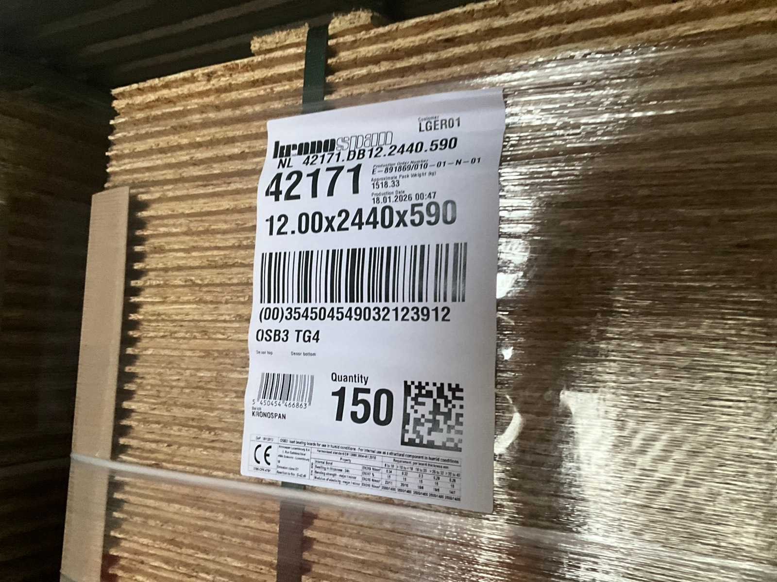 = 1 pallet. Nee Merk: Kronospan Type: OSB3 TG4 Plaatafmeting l: 2440mm Plaatafmeting b: 59mm Dikte: 12mm