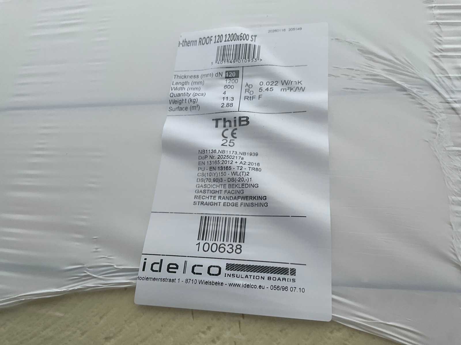Therm insulation boards 10 cm dikte, in verpakking, per 40 (10 pakken x4) exemplaren op pallet, telkens 4 stuks in een pak. 1 pak = voor 2,88 m2, totaal pallet = 28 m2. No Merk: IDELCO Product type: Therm Roof 120 mm Lengte: 120cm Breedte: 60cm Hoogte: 12cm