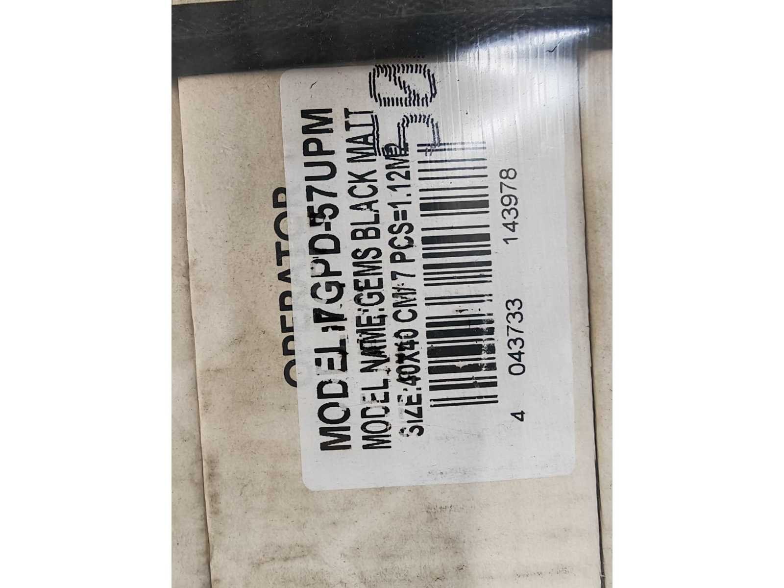 No Merk: RAK Kleur: Zwart Afwerking: Mat Lengte: 400mm Breedte: 400mm Dikte: 10mm Materiaal: Keramiek Type: Vloertegel Model: GPD57UP Aantal m² per verpakking: 1.12m² Aantal pakken: 60 Totaal oppervlakte: 67.2m² Totaal gewicht: 1350kg