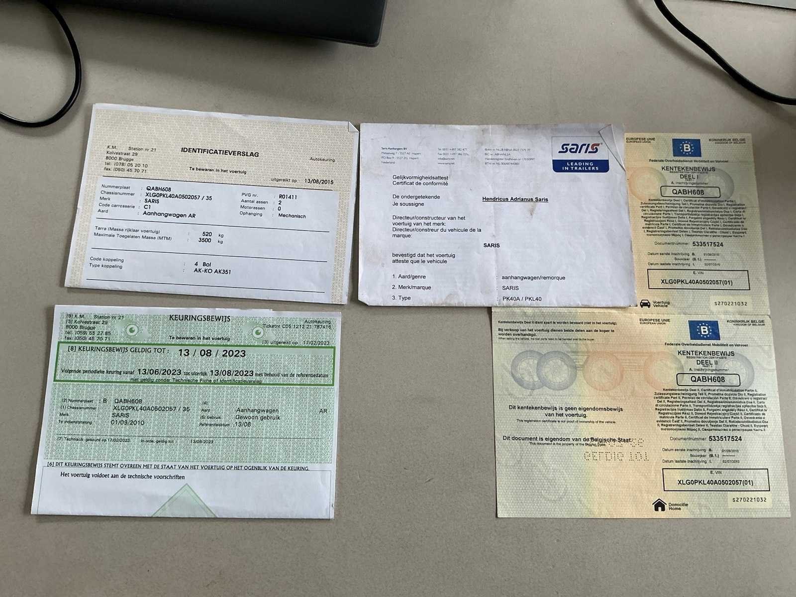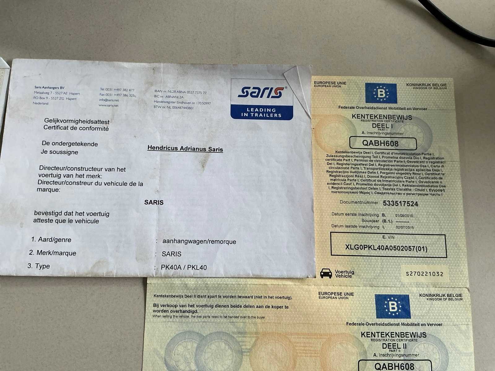 ID verslag, inschrijvingsbewijs deel 1+2 (doorprikt), gelijkvormigheidsattest Nee Merk: Saris Type: PK40A Bouwjaar: 2010 Chassisnummer: XLG0PKL40A0502057 Aantal assen: 2 Laadbak afmeting l: 330cm Laadbak afmeting b: 190cm Laadvermogen: 3500kg Datum eerste toelating: 01/09/2010 Kentekenpapieren compleet?: true Nationaliteit documenten: België