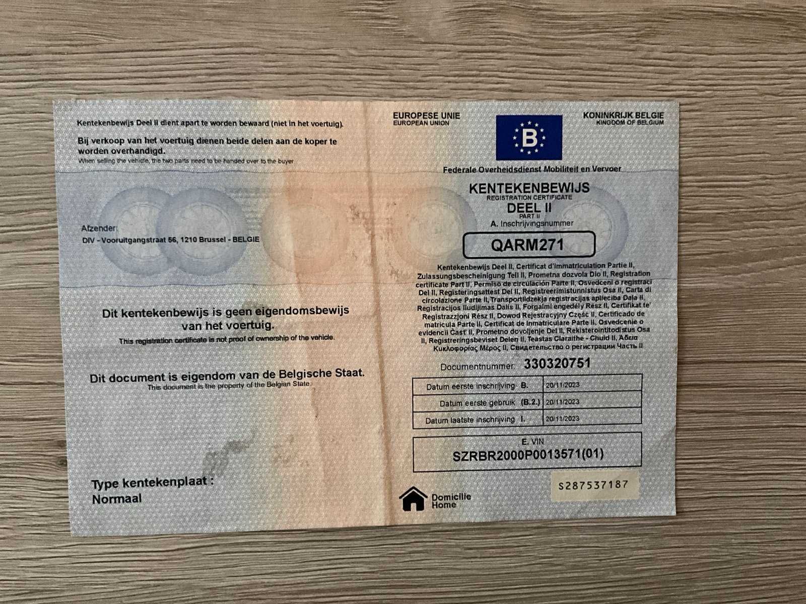 Inschrijvingsbewijs deel 2 aanwezig, deel 1 en gelijkvormigheidsattest ontbreken, zichtbare schade, typeplaat ontbreekt, neuswiel ontbreekt, aanhangwagen is ouder dan 1ste m.i.g. vermoedelijk bouwjaar 1993 No Merk: Niewiadow Type: BR2 Model: BR2 Bouwjaar: 2023 Chassisnummer: SZRBR2000P0013571 Aantal assen: 2 Laadvermogen: 2700kg Datum eerste toelating: 20/11/2023 Nationaliteit documenten: Belgische