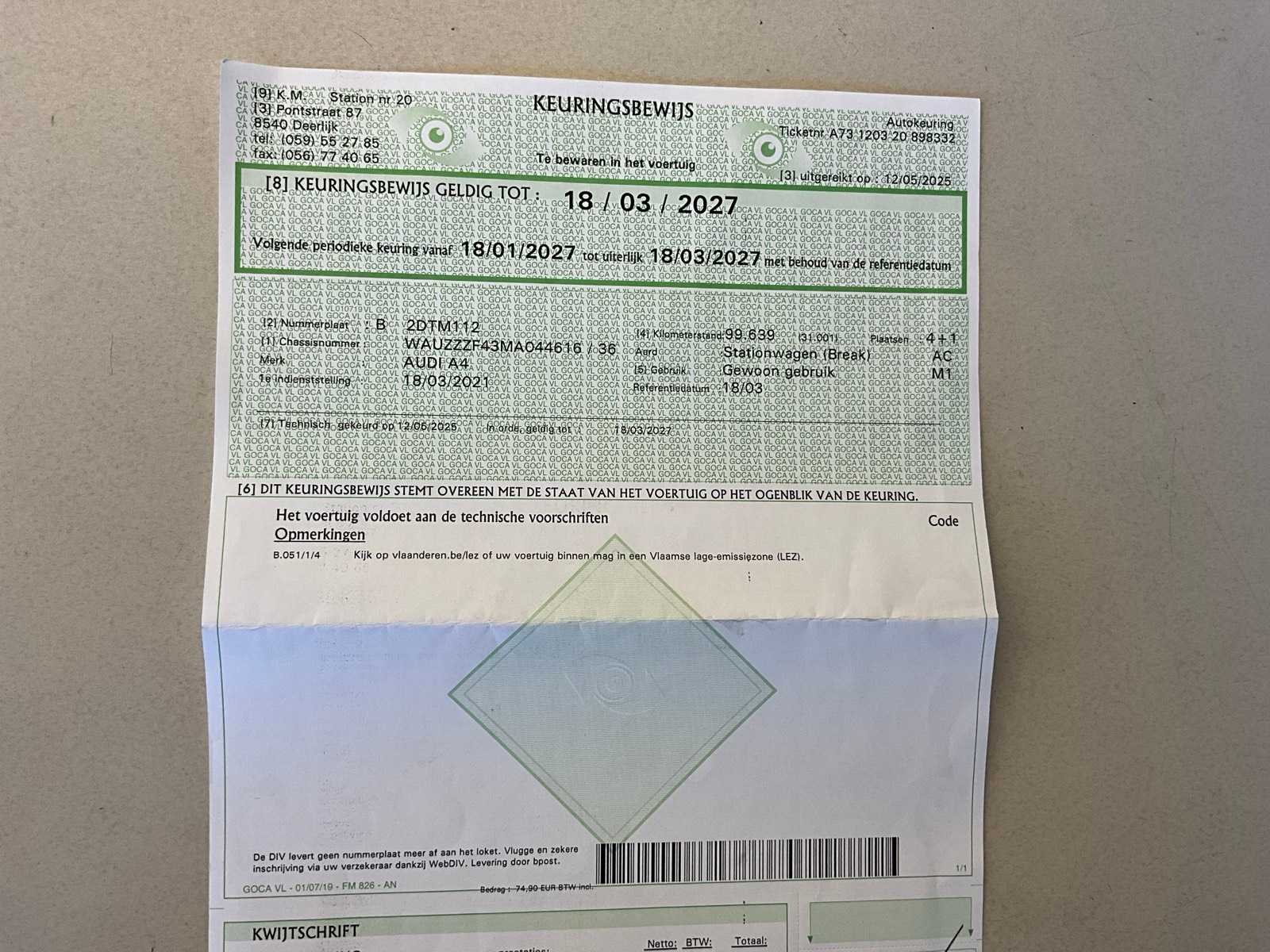 No Merk: Audi Model: A4 Type: Avant Bouwjaar: 2021 Afgelezen kilometerstand: 119292km Cilinderinhoud: 1968cc Vermogen (kW): 100kW Brandstof: hybride (elektrisch+diesel) Chassisnummer: WAUZZZF43MA044616 Datum eerste toelating: 18/03/2021 Aantal zitplaatsen: 5 Transmissie: Automaat Emissieklasse: Euro 6 Aantal deuren: 5 Aantal sleutels: 2 Nationaliteit documenten: B Gelijkvormigheidsattest aanwezig: true Start en rijdt: Ja Keuringsrapport geldig tot: 18/03/2027 Andere boorddocumenten: Keuringsbewijs Vavato voert geen technische keuring uit.: true Inschrijvingsbewijs - deel 1 : Aanwezig Inschrijvingsbewijs - deel 2: Aanwezig