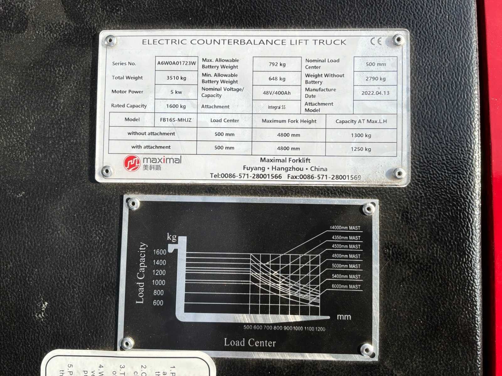 Ongebruikt Nee Merk: Maximal Type: FB16S-MHJZ Bouwjaar: 2022 Serienummer: A6W0A01723W Brandstof: Elektrisch Aantal wielen: 3 Afgelezen urenstand: 6 Accu lader: true Free-lift: true Side-shift: true Triple mast: true Eigen gewicht: 3510kg Hefvermogen: 1600kg Lepellengte: 1220mm Max. hefhoogte: 4800mm Vol rubber banden: true Minimale doorrijhoogte: 2200mm Totale afmeting Breedte: 1180mm