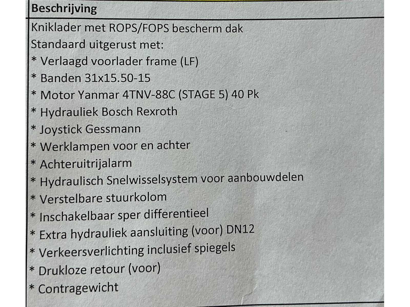 - ongebruikt. - inclusief vorkenbord. - snelwissel. - extra info zie foto. Nee Merk: Bull Type: WL35LF Bouwjaar: 2024 Serienummer: 2401397 Merk motor: Yanmar Aantal cilinders: 4 Brandstof: Diesel Graafbak afm. b: 1400mm Bandenmaat: 31x15.5-15 Afgelezen urenstand: 1