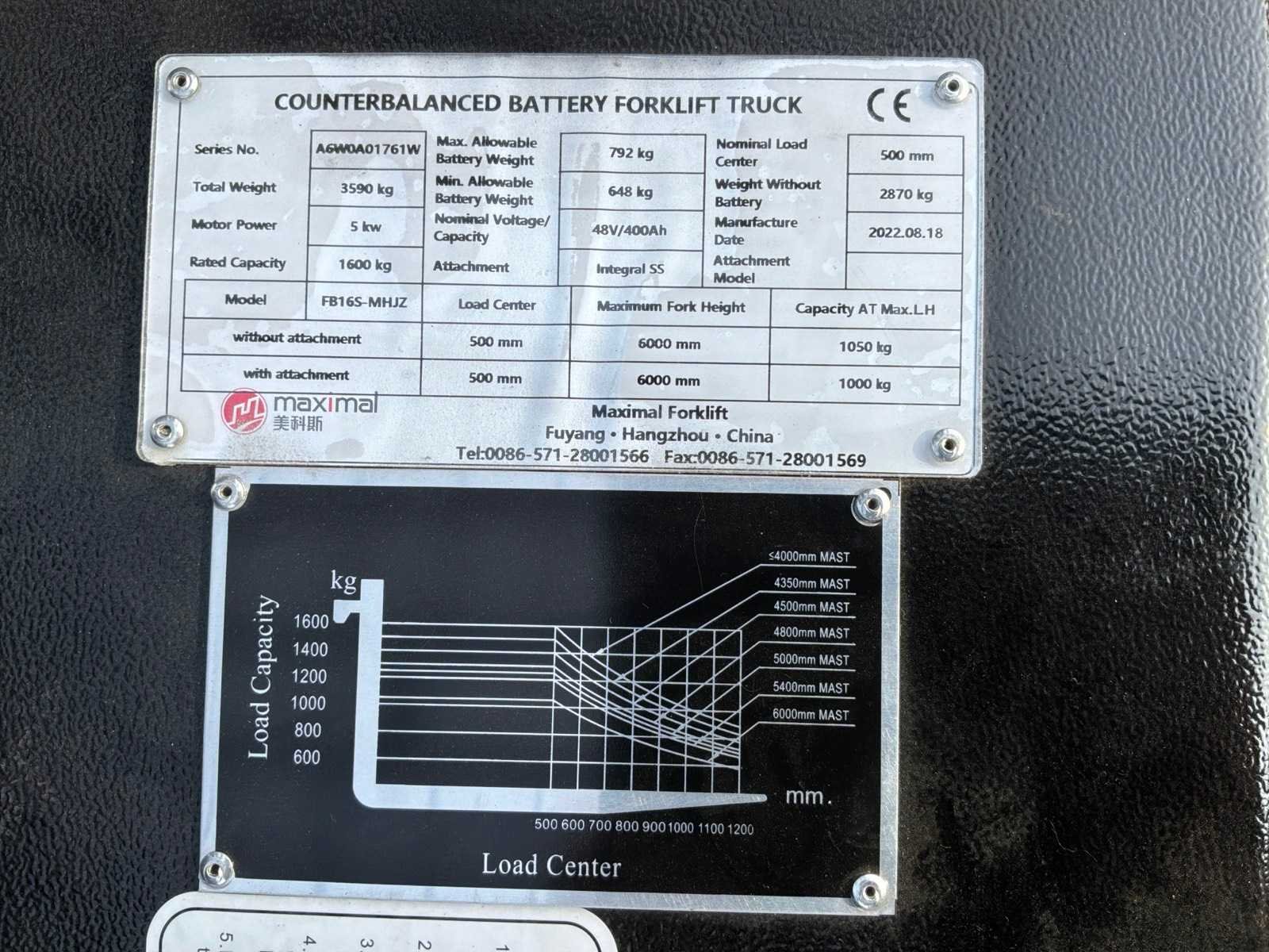 Ongebruikt Nee Merk: Maximal Type: FB16S-MHJZ Bouwjaar: 2022 Serienummer: A6WOA01761W Brandstof: Elektrisch Aantal wielen: 3 Afgelezen urenstand: 4 Accu lader: true Free-lift: true Side-shift: true Triple mast: true Eigen gewicht: 3590kg Hefvermogen: 1600kg Lepellengte: 1200mm Max. hefhoogte: 6000mm Vol rubber banden: true Minimale doorrijhoogte: 2140mm Totale afmeting Breedte: 1070mm