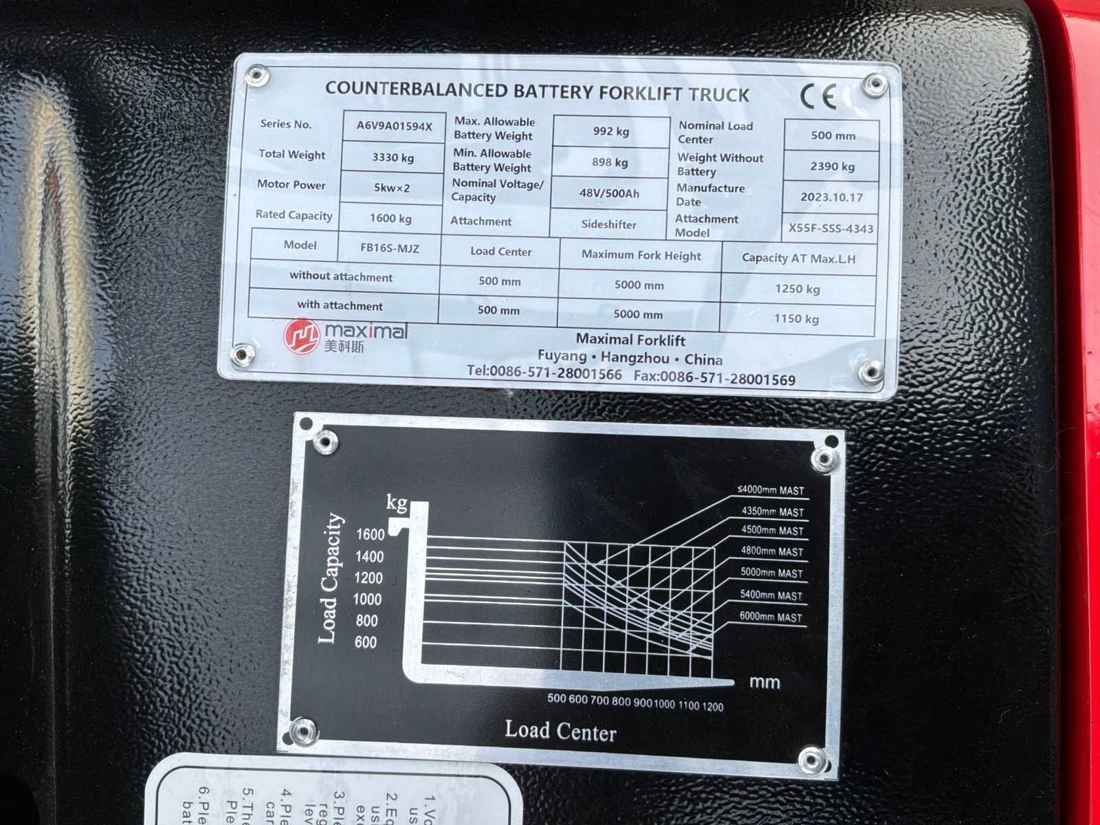 <Br> - Ongebruikt. - Voorzien van 4de hydraulische functie, niet in gebruik. Nee Merk: Maximal Type: FB16S-MJZ Bouwjaar: 2023 Serienummer: A6V9A01594X Brandstof: Elektrisch Aantal wielen: 3 Afgelezen urenstand: 5 Accu lader: true Free-lift: true Side-shift: true Triple mast: true Eigen gewicht: 3330kg Hefvermogen: 1600kg Lepellengte: 1220mm Max. hefhoogte: 5000mm Vol rubber banden: true Minimale doorrijhoogte: 2240mm Totale afmeting Breedte: 1070mm