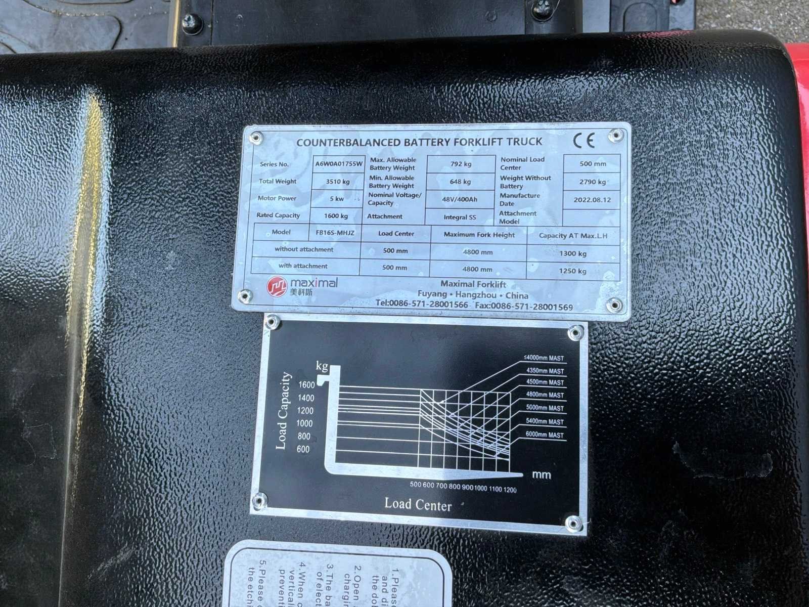Nee Merk: Maximal Type: FB16S-MHJZ Bouwjaar: 2022 Serienummer: A6W0A01755W Brandstof: Elektrisch Mast: Triple Soort band: Volrubber banden Aantal wielen: 3 Afgelezen urenstand: 6 Accu lader: true Free-lift: true Side-shift: true Triple mast: true Eigen gewicht: 3510kg Hefvermogen: 1600kg Lepellengte: 1200mm Max. hefhoogte: 4800mm Vol rubber banden: true Minimale doorrijhoogte: 2150mm
