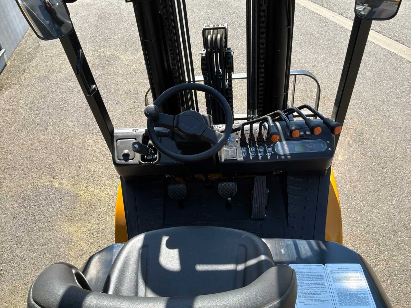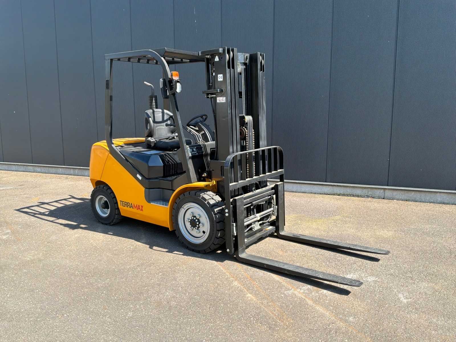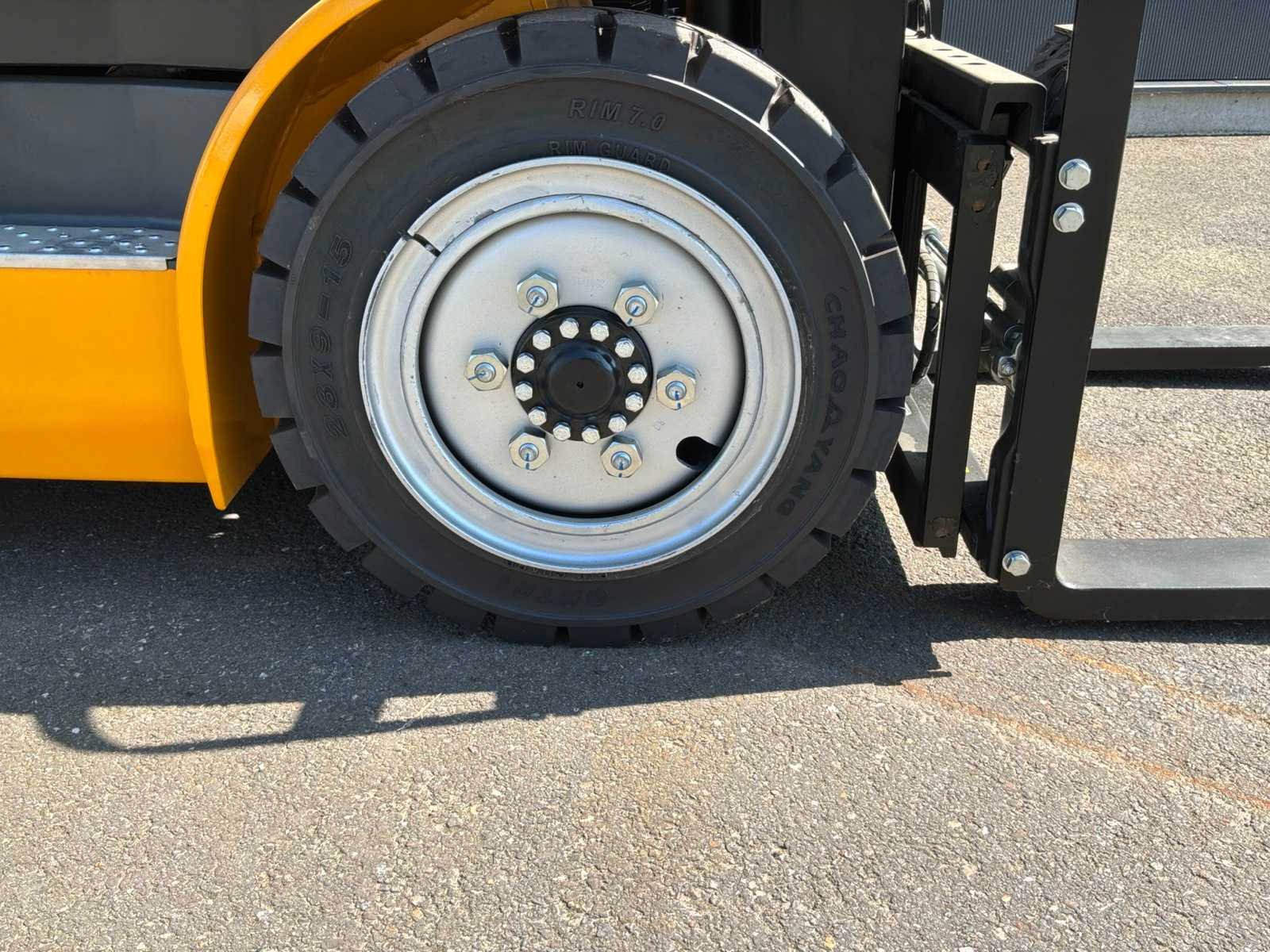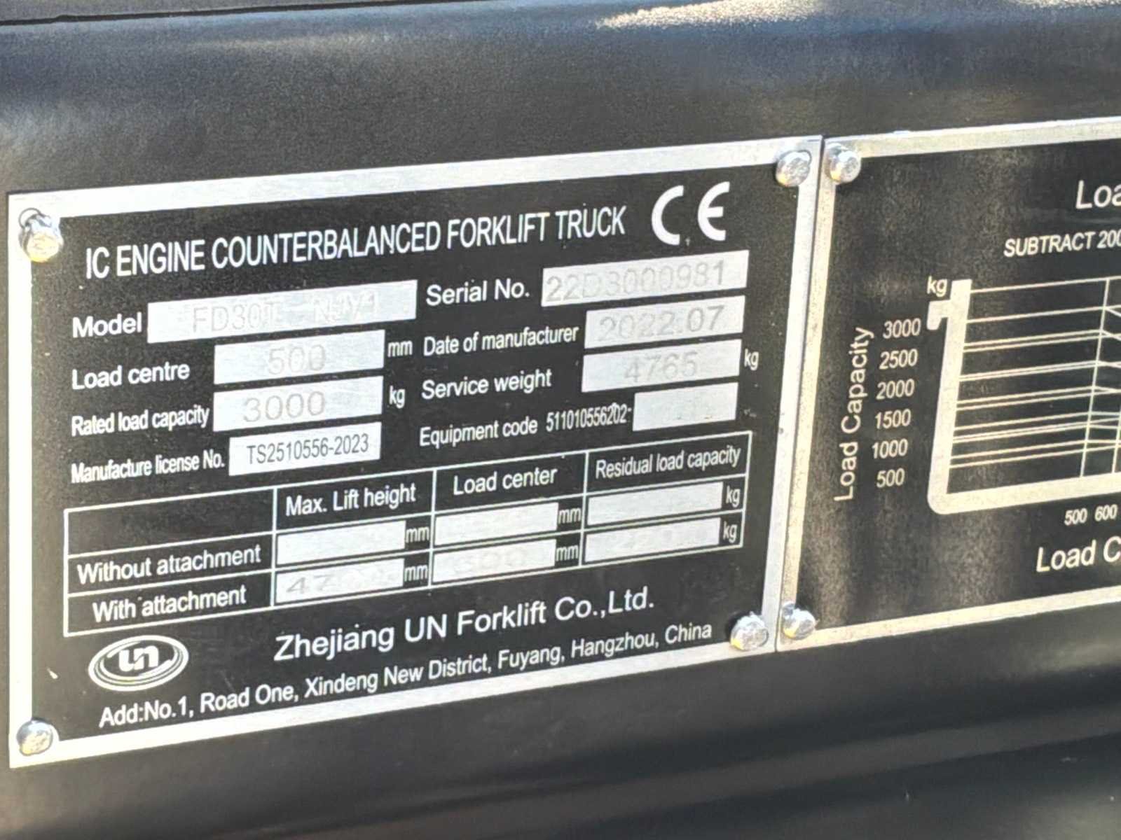 Kubota motor Nee Merk: Zheijang UN Type: FD25T-NJV1 Bouwjaar: 2022 Serienummer: 22D3000981 Brandstof: Diesel Aantal wielen: 4 Afgelezen urenstand: 3.9 Free-lift: true Side-shift: true Hydraulisch verstelbare lepels: true Triple mast: true Eigen gewicht: 4765kg Hefvermogen: 3000kg Lepellengte: 1220mm Max. hefhoogte: 4700mm Vol rubber banden: true Minimale doorrijhoogte: 2240mm